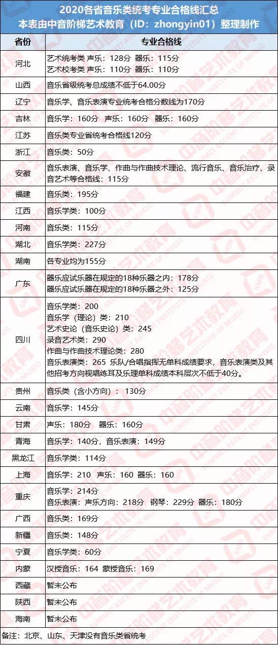看点二 2020年各省音乐类统考专业合格分数线