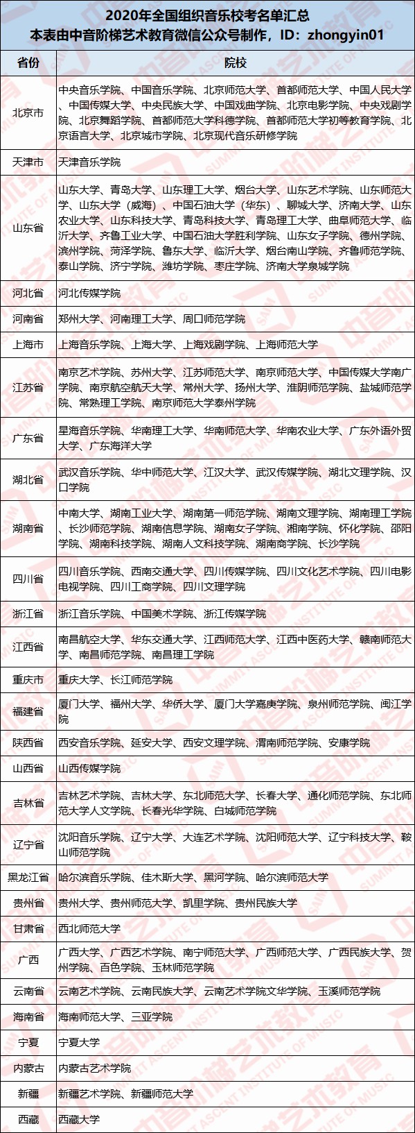 2020年组织音乐校考院校名单