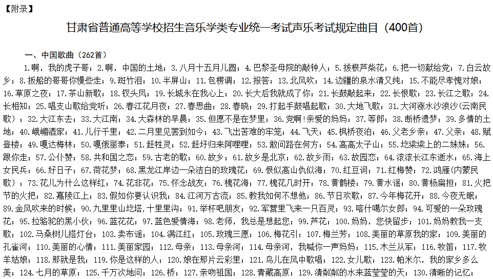 例如甘肃省2021年音乐学统考大纲有声乐考试曲目,中国歌曲和外文歌曲多达500首。