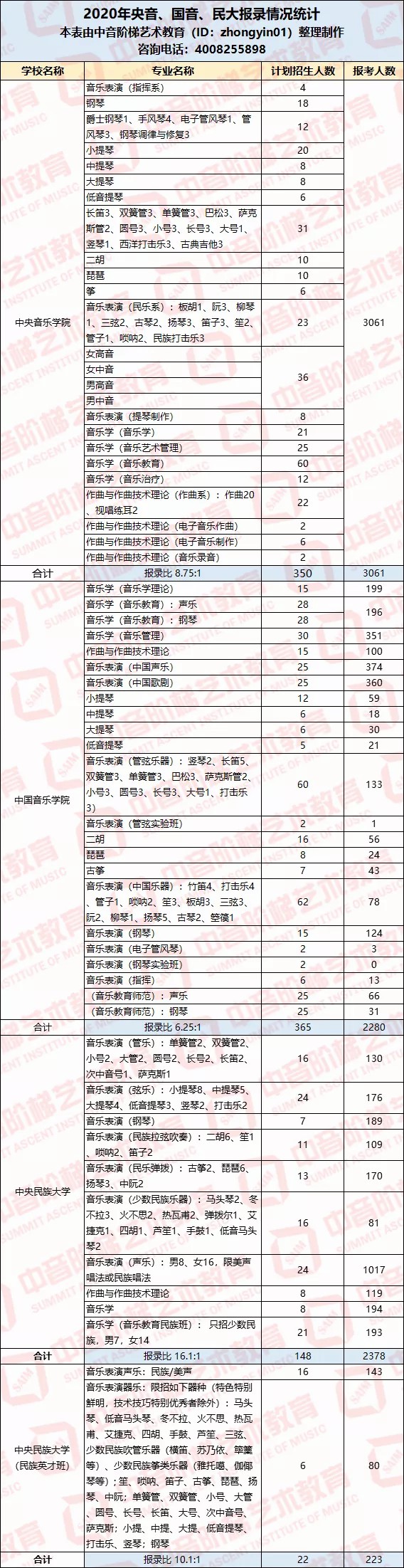 2020年中央音乐学院、中国音乐学院、中央民族大学校考报录比