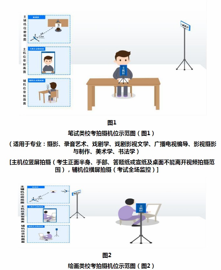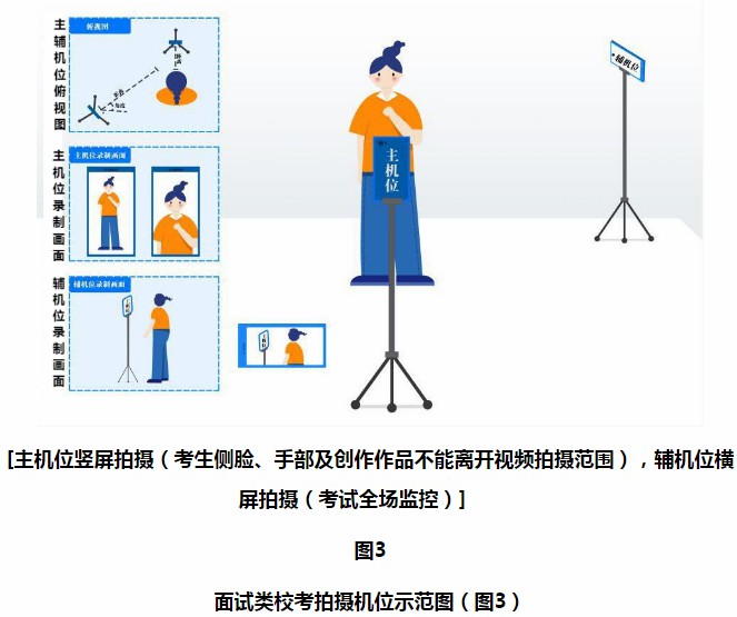 [主机位根据考试科目要求确定拍摄方向(横屏或竖屏)及拍摄范围,辅机位横屏拍摄(考试全场监控)]