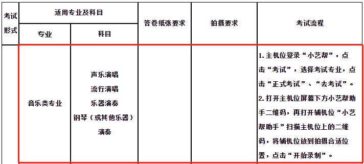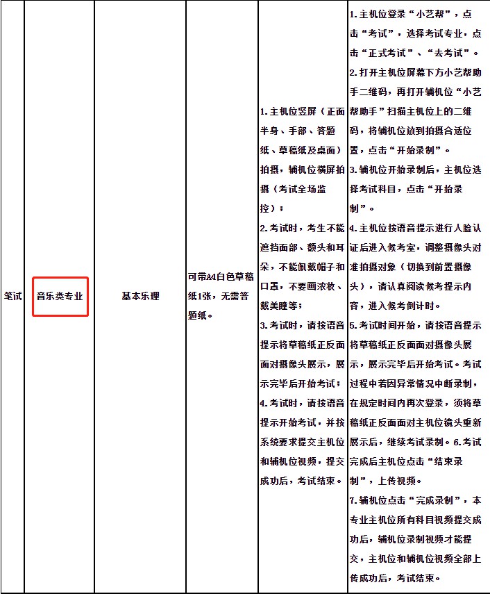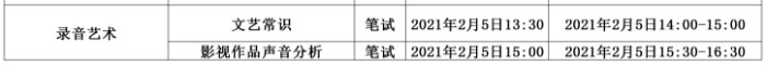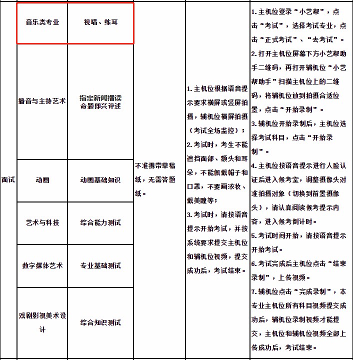 (适用于专业及科目:音乐类(除钢琴演奏外)、播音与主持艺术(自备文学作品朗读)、动画(动画基础知识)、艺术与科技(综合能力测试)、数字媒体艺术(专业基础测试)、戏剧影视美术设计(综合知识测试)]