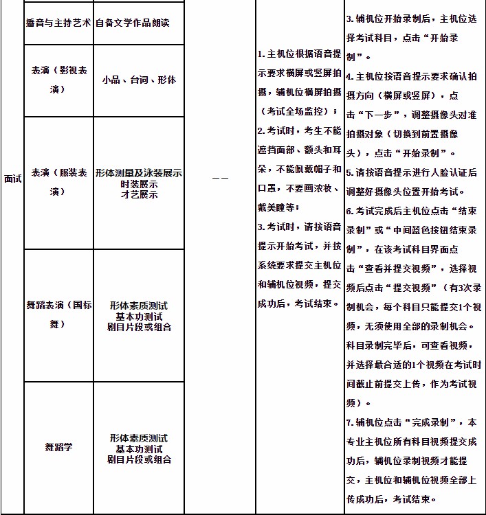 5.根据专业科目考试不同性质,音乐类专业“声乐演唱、流行演唱、乐器演奏、钢琴(或其他乐器演奏)”考试科目,播音与主持艺术专业“自备文学作品朗读”考试科目和舞蹈类专业各考试科目、表演类专业各考试科目均有3次视频录制机会,考试结束可回看录制的视频,觉得较合适的视频,即可作为考试视频提交上传,无须使用全部的录制机会。