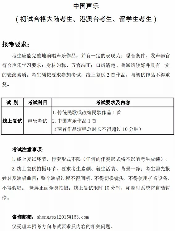 音乐学、音乐管理、音乐教育、音乐教育师范专业仅有线上一试,线上考试合格名单即为本人专业合格证(具体名单见今日公众号二条)。这些专业同学们可以安心准备文化课了,其他专业提起精神,夯实专业,准备年后线上复试吧!