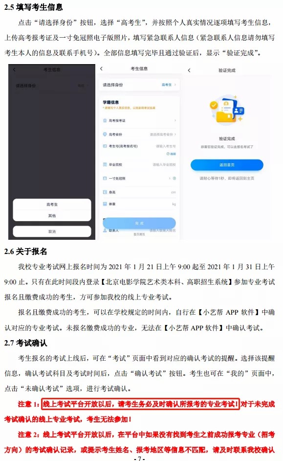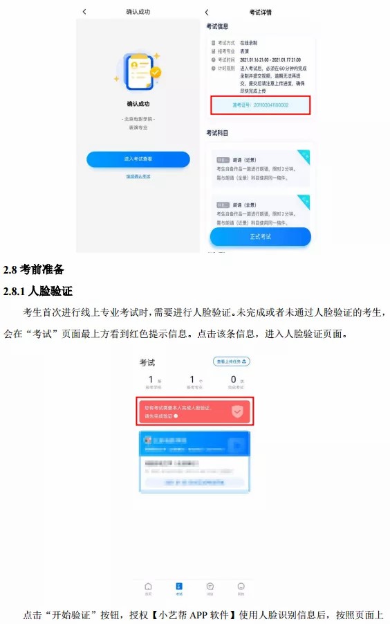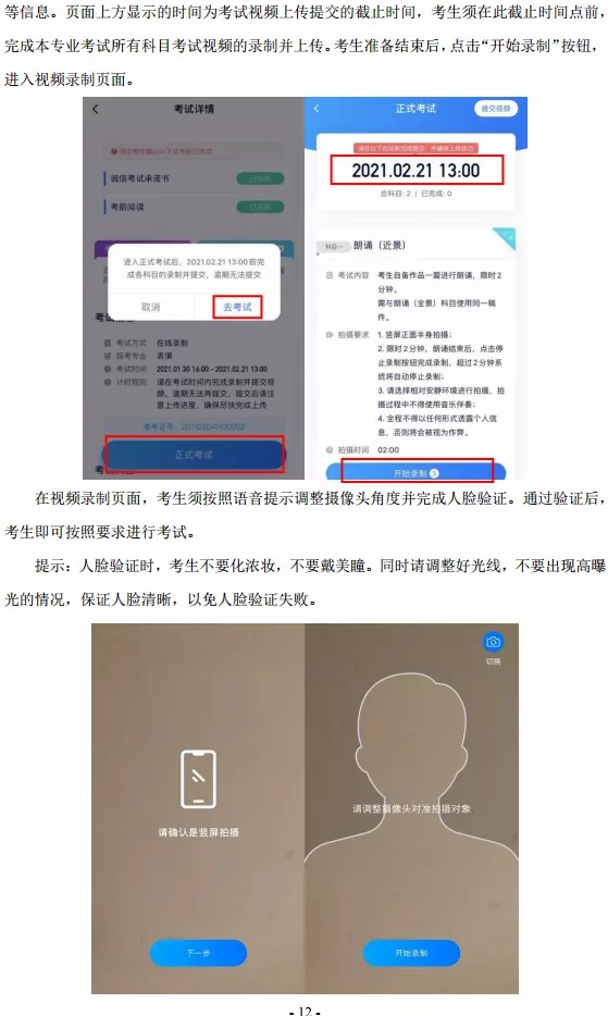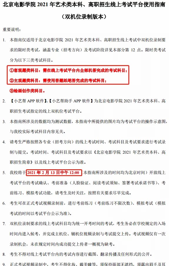 1.按照《北京电影学院2021年艺术类本科、高职招生简章》的规定,我校专业考试线上考试平台将于2021年2月13日中午12:00开放。届时请考生登陆线上考试平台,完成确认考试、考前准备(人脸验证、阅读考试须知、签署考试书等)、考前练习、等步骤,为正式考试做好相关准备。Mqg音乐培训_音乐艺考培训学校-