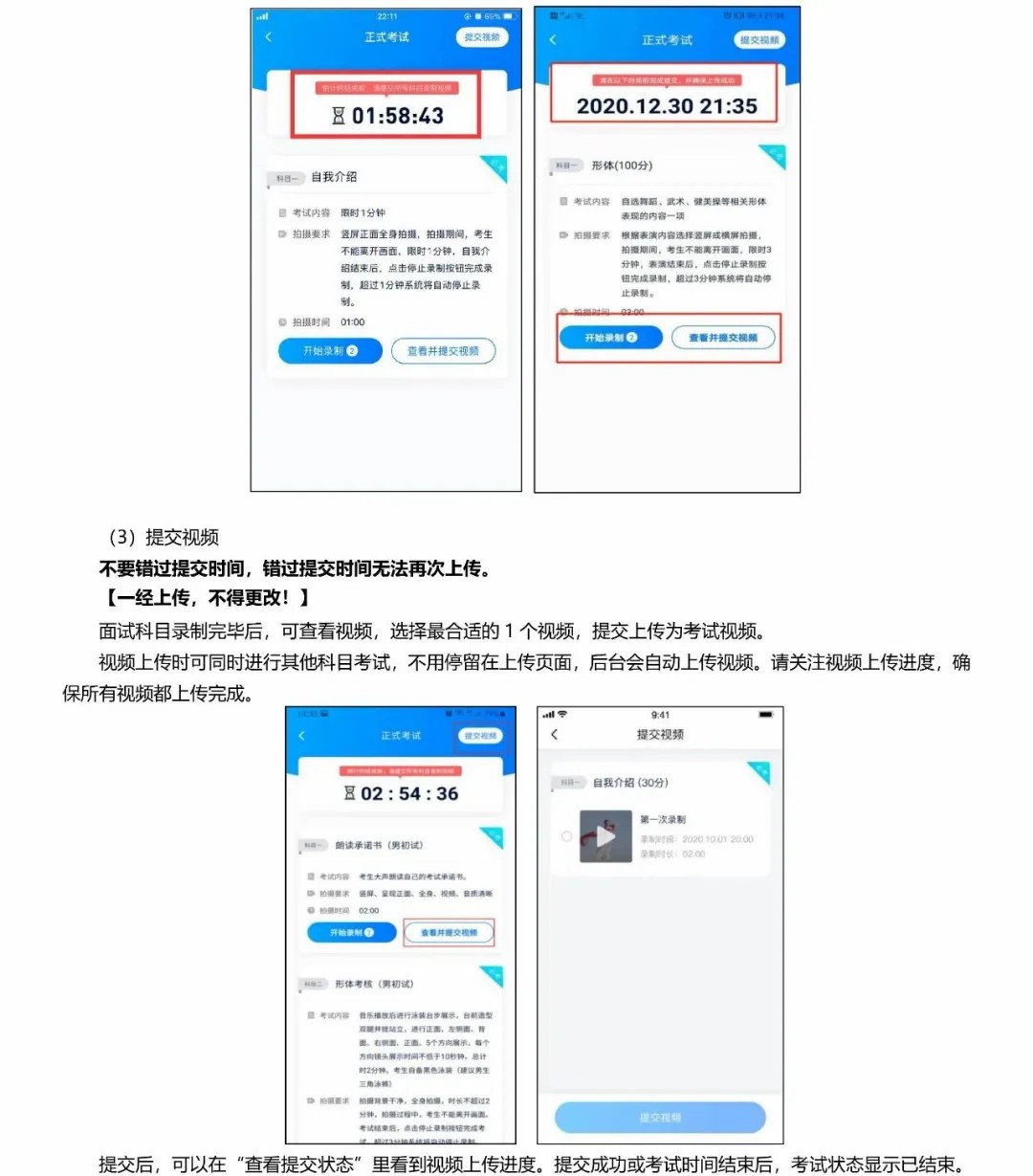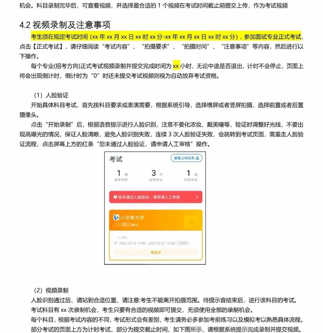 考生须严格按照我校的各项要求,在规定的时间内完成视频作品录制与提交,逾期不提交作品视为弃考。
