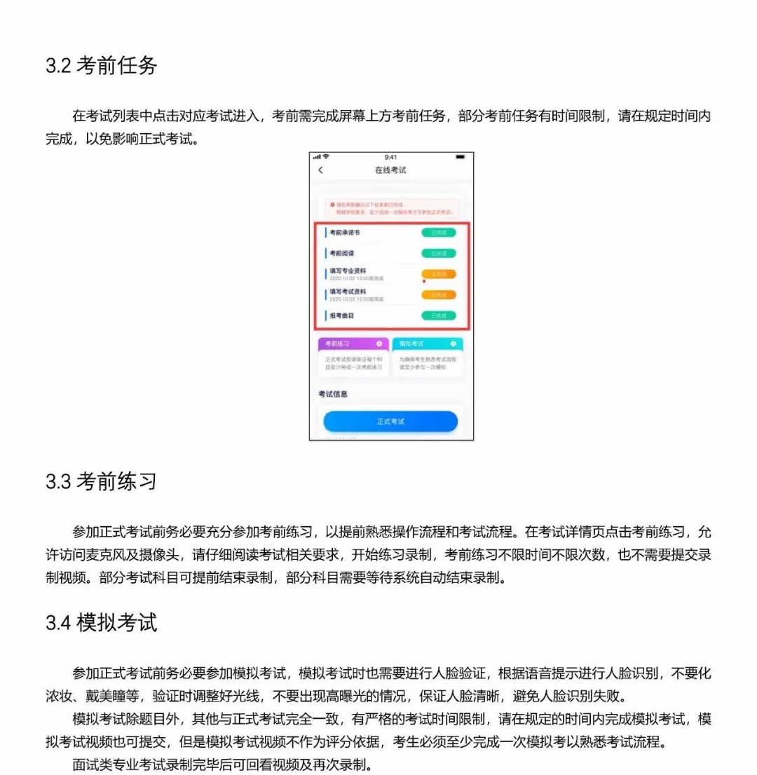 4.:点击【】,限定3次,一次时间为2个小时3次录制机会,考生必须参加不少于1次的以熟悉考试流程。时也需要进行人脸验证,根据语音提示进行人脸识别,不要化浓妆、戴美瞳等,验证时调整好光线,不要出现高曝光的情况,人脸清晰,避免人脸识别失败。与正式考试完全一致,视频也可提交,但是视频不作为评分依据。