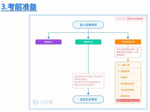 2.正式考试前:①进行考前练习和,熟悉小艺帮 APP 的 操作流程和考试流程;②完成“考生书”电子签名和“考前阅读”,不完成不能参加考试。