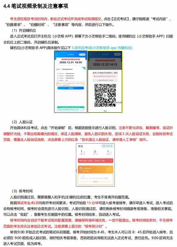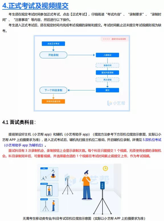 5.所有考试科目视频录制均采用双机位。双机位考试时,先下载安装小艺帮 APP 的手机为主考手机,再用另一部手机下载安装小艺帮助手 APP 作为辅考手机。主机位录制视频为考试评审依据、辅机位录视频为考试过程监督依据,不能有缺项,务必全部内容成功上传。