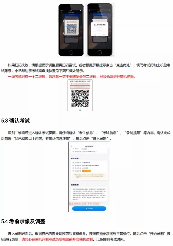(1) 进入/正式考试的双机位考试时,须用辅机扫描考试页面较下方的二维码,开启辅机位录制。该二维码仅限考生本人使用。视频录制要求主机位和辅助机位的两部手机一镜到底不间断录制,录制全程不允许静 音,画面中仅允许出现考生本人,不得随意切换拍摄角度,不得有暗示性的言语或行为,视频作品中不得出现任 何可能影响评判公正的信息或标识,如含考生信息的提示性文字、图案、声音、背景、着装等。不得采取任何视 频编辑手段处理画面,必须保持作品完整真实。