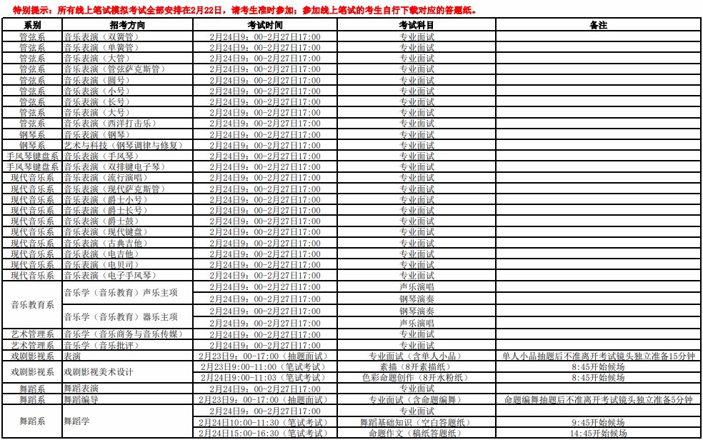 备注:所有项目录制成一个视频,总时长不超过 20 分钟。其中指挥视频要求考生面对摄像镜头,录制完整肢体及手势,时长不超过 12 分钟;乐器演奏(曲目自选),时长不超过 5 分钟;歌曲演唱时长不超过 3 分钟。