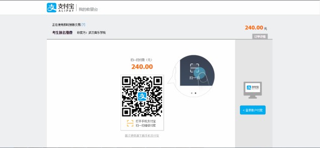注意:请确认收款方为武汉音乐学院,金额与系统缴费金额一致后再行缴费。