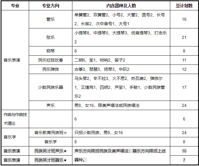 少数民族乐器:2020年总招16人,2021年总招17人,增加1人。其中,四胡2020年招生1人,2021年招生2人,增加1人;低音马头琴2020年招生2人,2021年停招;新增少数民族管乐2人。