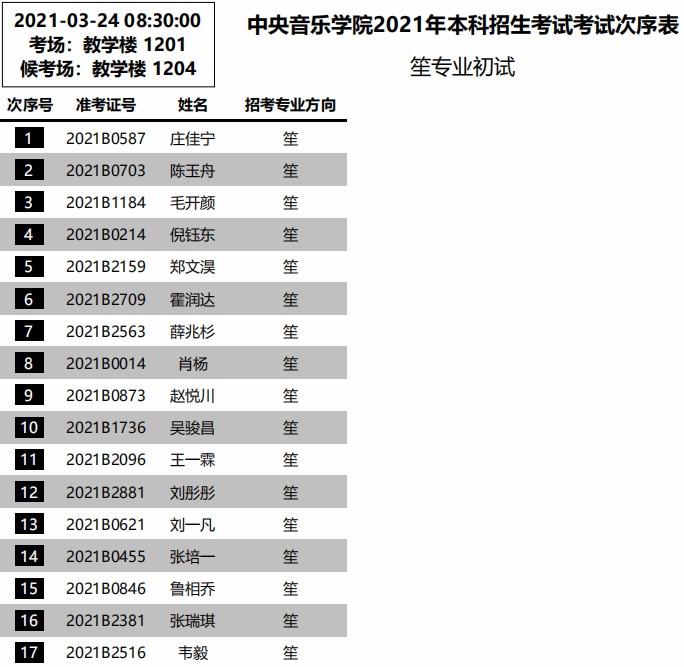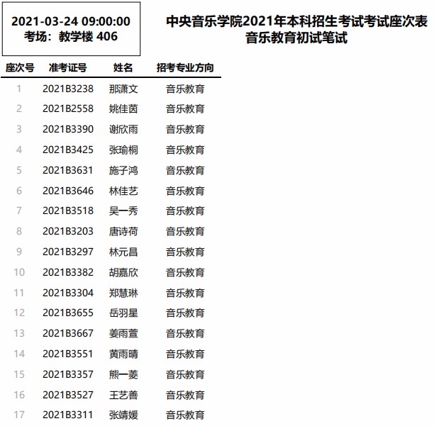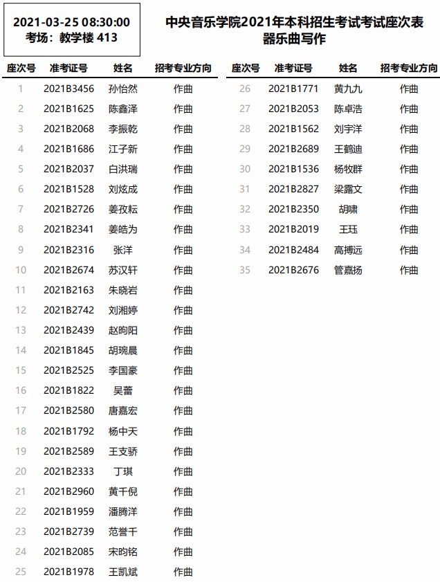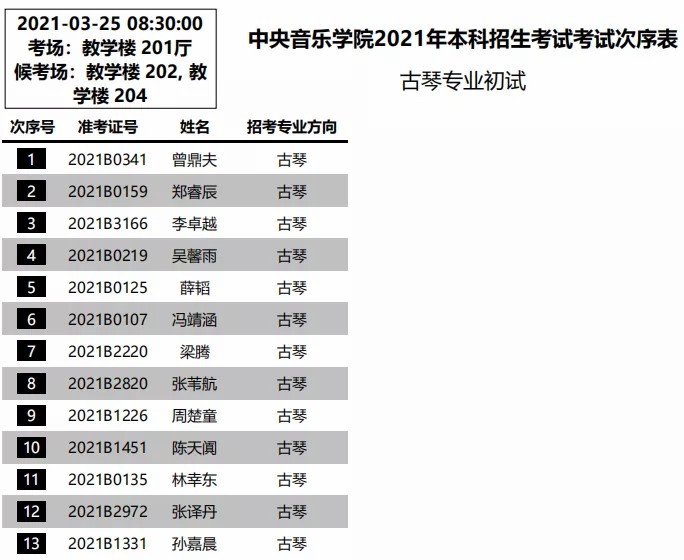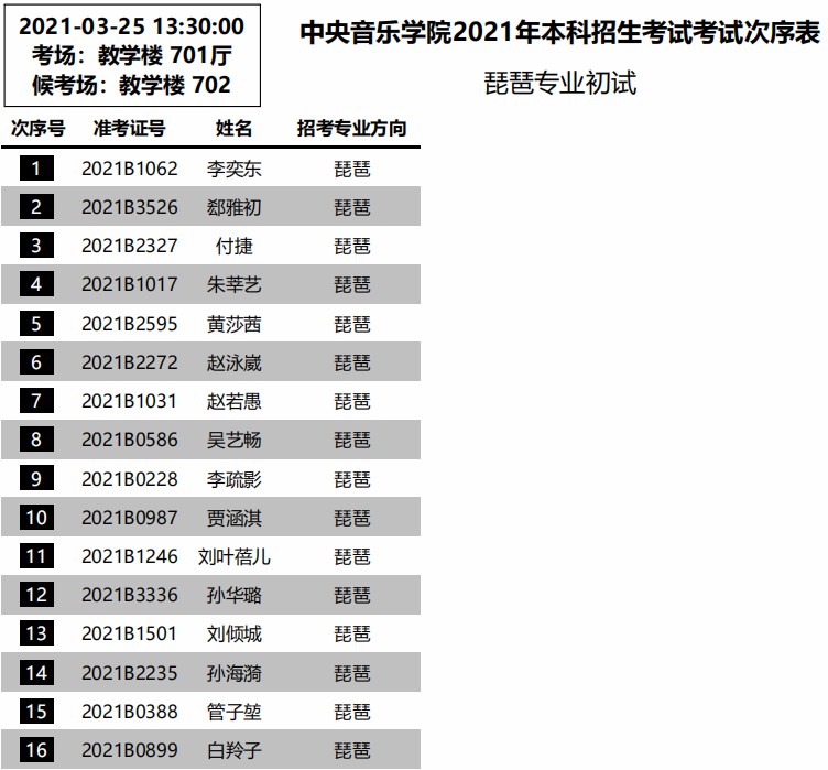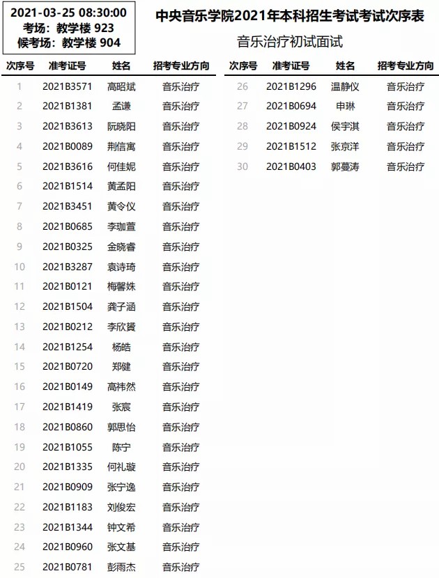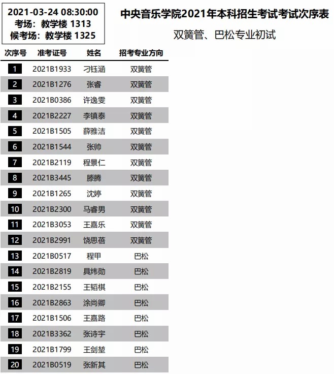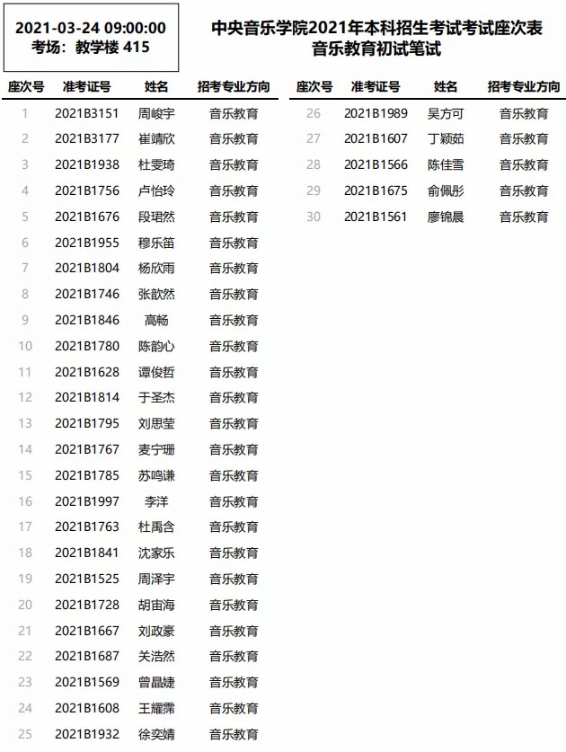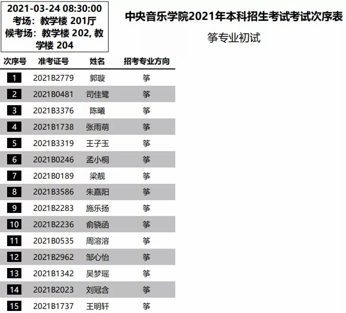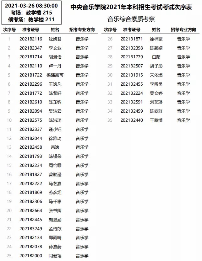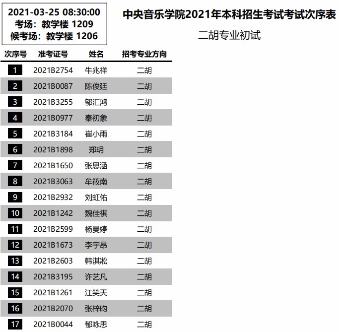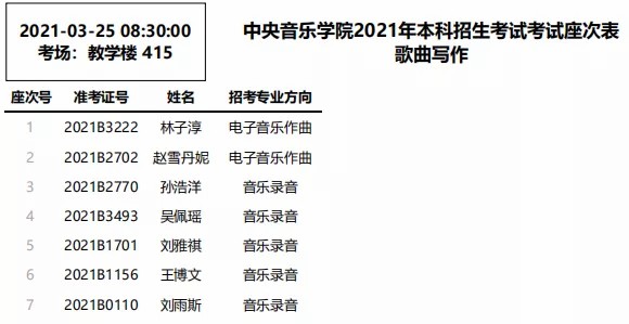 现公布我校作曲系、音乐学系各招考方向初试各科目考场次序表/座次表(详见附件)。视唱练耳招考方向专业笔试(听写)开考即有听辨,迟到者不得进入考场;器乐曲写作、艺术歌曲写作、音乐学招考方向写作、艺术管理招考方向写作考试迟到15分钟者不得进入考场。NPB音乐培训_音乐艺考培训学校-