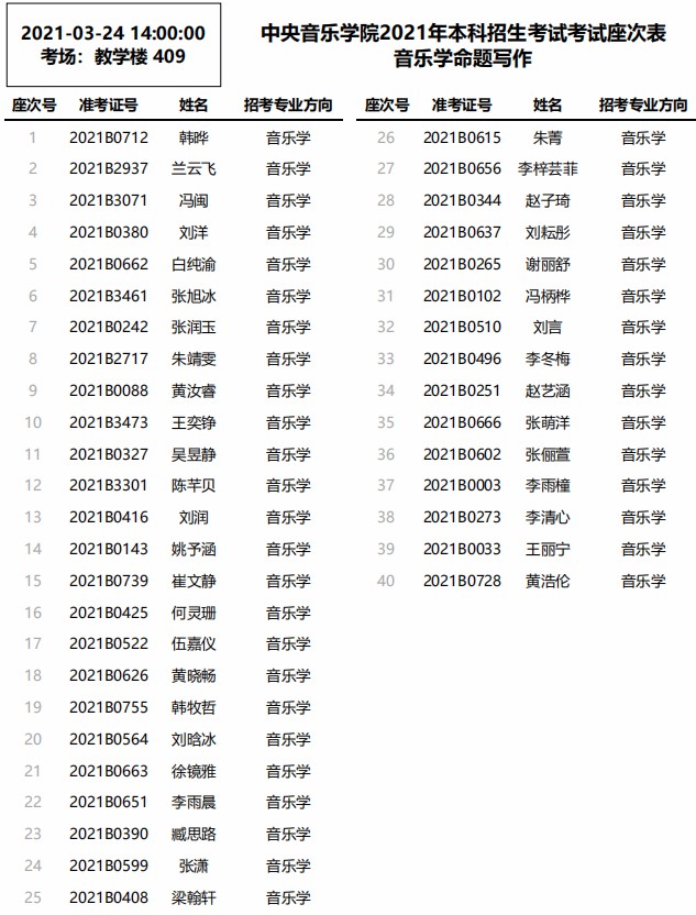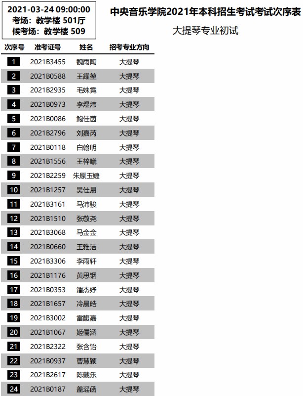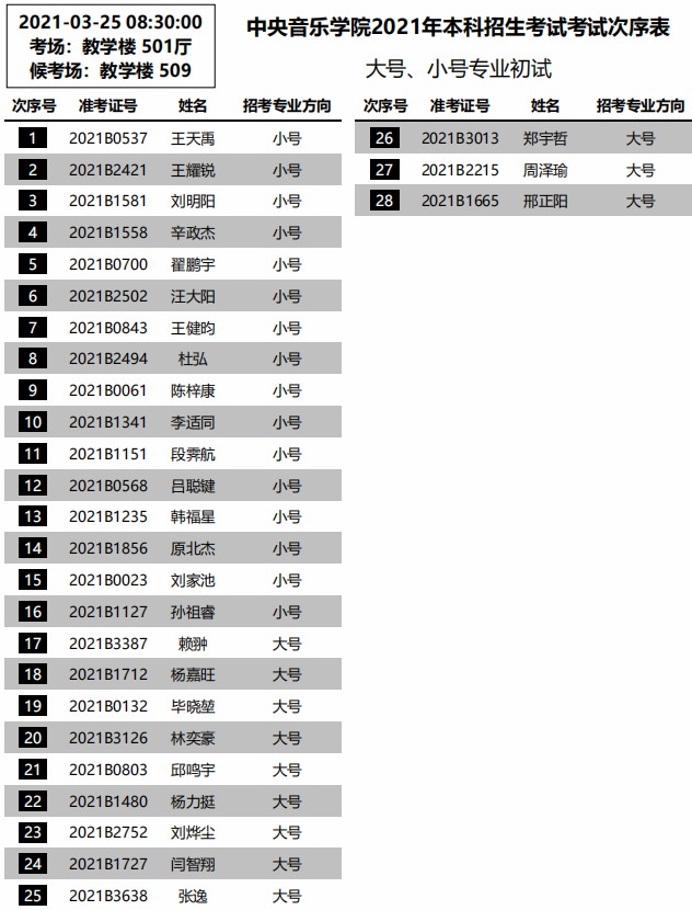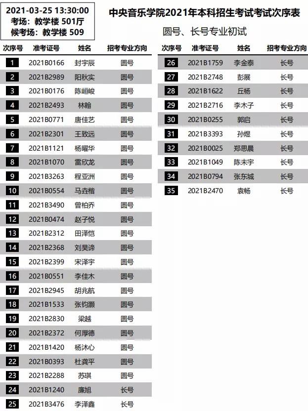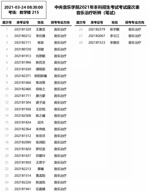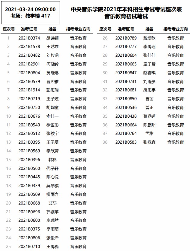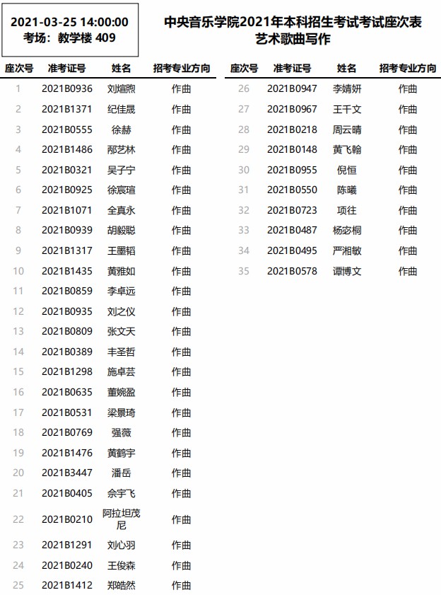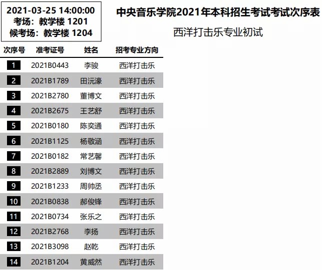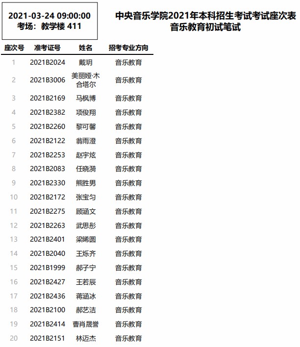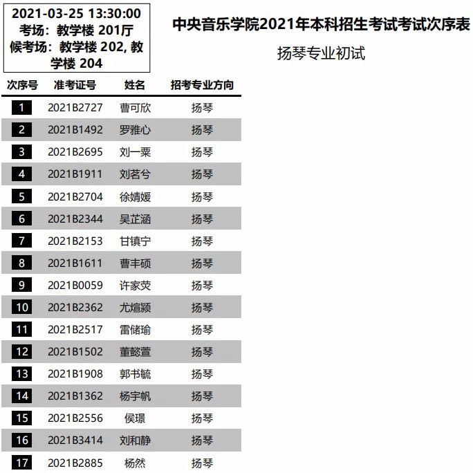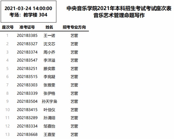 现公布我校作曲系、音乐学系各招考方向初试各科目考场次序表/座次表(详见附件)。视唱练耳招考方向专业笔试(听写)开考即有听辨,迟到者不得进入考场;器乐曲写作、艺术歌曲写作、音乐学招考方向写作、艺术管理招考方向写作考试迟到15分钟者不得进入考场。NPB音乐培训_音乐艺考培训学校-