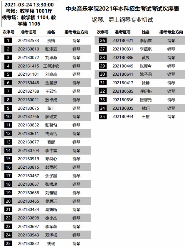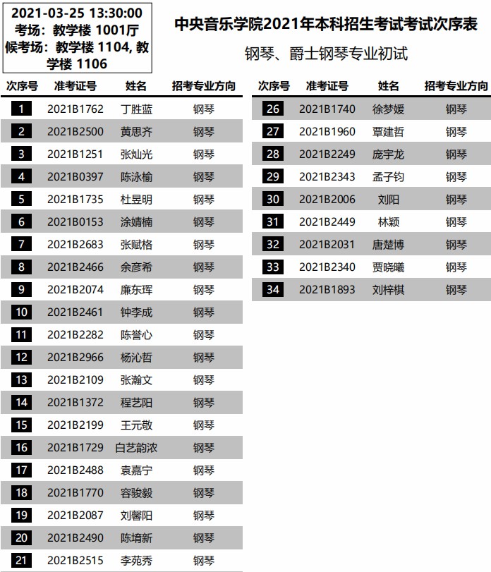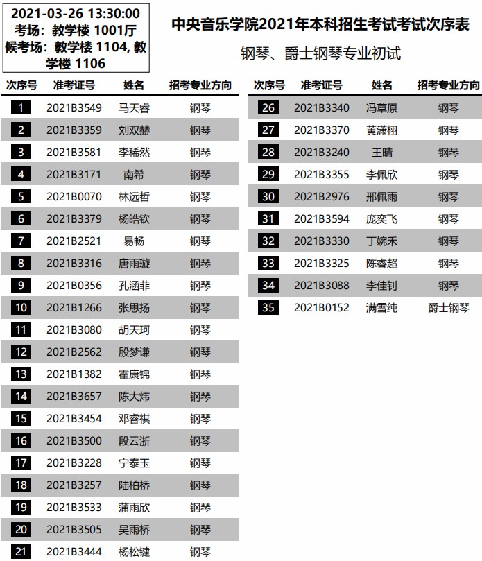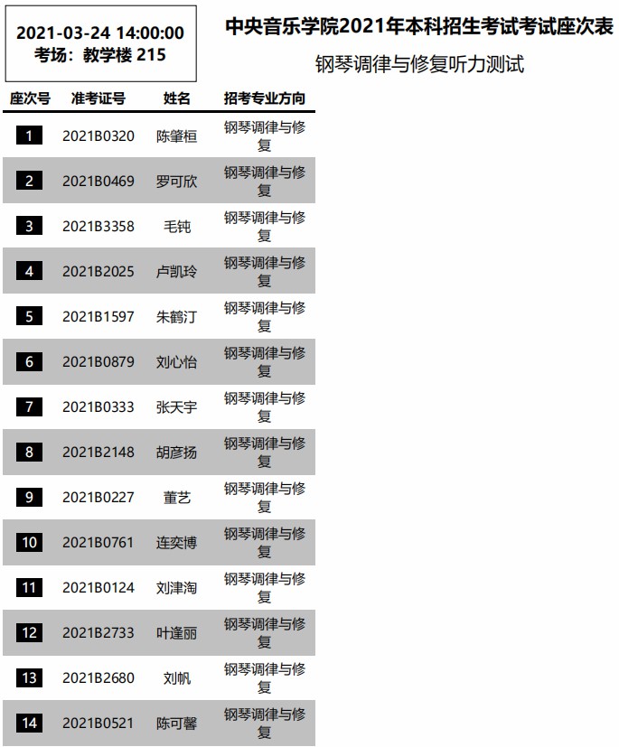 现公布我校钢琴系初试各科目考场次序表/座次表(详见附件)。钢琴调律与修复招考方向-听力测试开考即有听辨,迟到者不得进入考场。管风琴招考方向选择使用管风琴考试的考生,于26日上午调试考试用琴,具体时间另行通知。NPB音乐培训_音乐艺考培训学校-