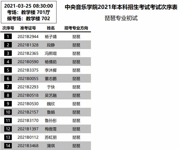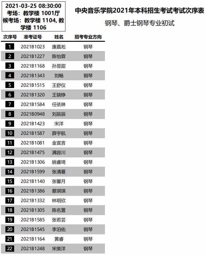 考试安排以公布的考场次序表/座次表为准,请考生务必下载、核对本人考场次序/座次表,并根据本人考试次序做好时间安排,务必提前候考,以免贻误考试。NPB音乐培训_音乐艺考培训学校-