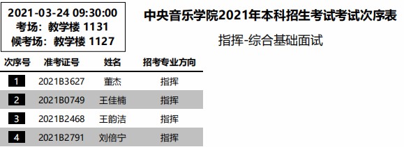 现公布我校指挥系、管弦系、民乐系、声乐歌剧系初试各科目考场次序表(详见附件),考试安排以公布的考场次序表为准,请考生务必下载、核对本人考场次序表,并根据本人考试次序做好时间安排,务必提前候考,以免贻误考试。NPB音乐培训_音乐艺考培训学校-