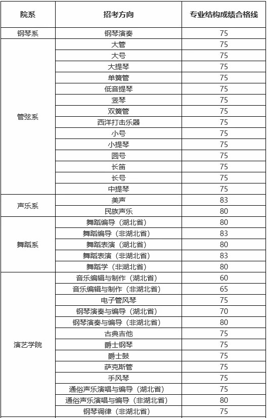 1.湖北省考生报考音乐学(音乐学理论、音乐管理、音乐心理与治疗、钢琴调律)方向安排在艺术本科(一)统考音乐学类平行志愿模块招生,湖北省考生报考舞蹈学专业安排在艺术本科(一)统考舞蹈学类平行志愿模块招生,按照我省今年艺术本科(一)平行志愿有关招生录取政策执行。我校不专门划定校考专业考试合格线、不发布专业考试合格名单。