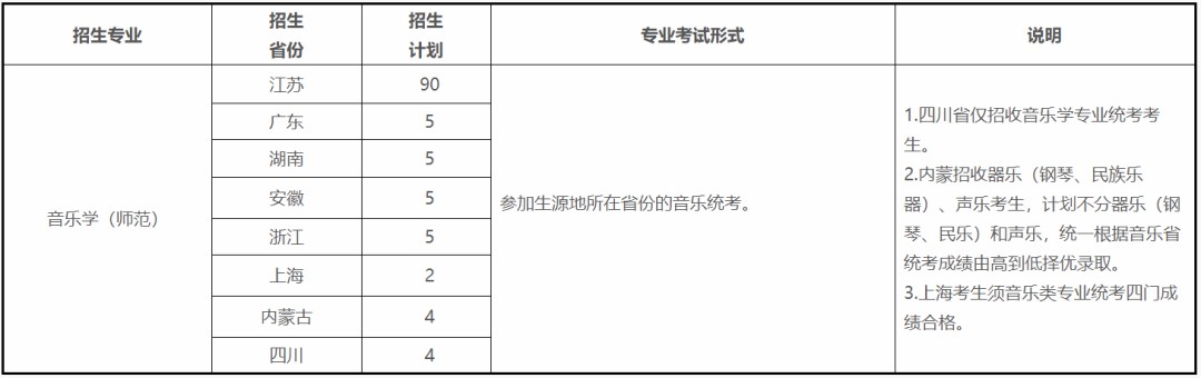 2.我校在生源省采取非平行志愿投档模式的省(市):报考南京师范大学音乐学(师范)专业的考生,且高考文化分和专业分(统考)均达到生源地省级招生主管部门要求,学校将进档考生按照各省专业统考的专业分由高到低排序。