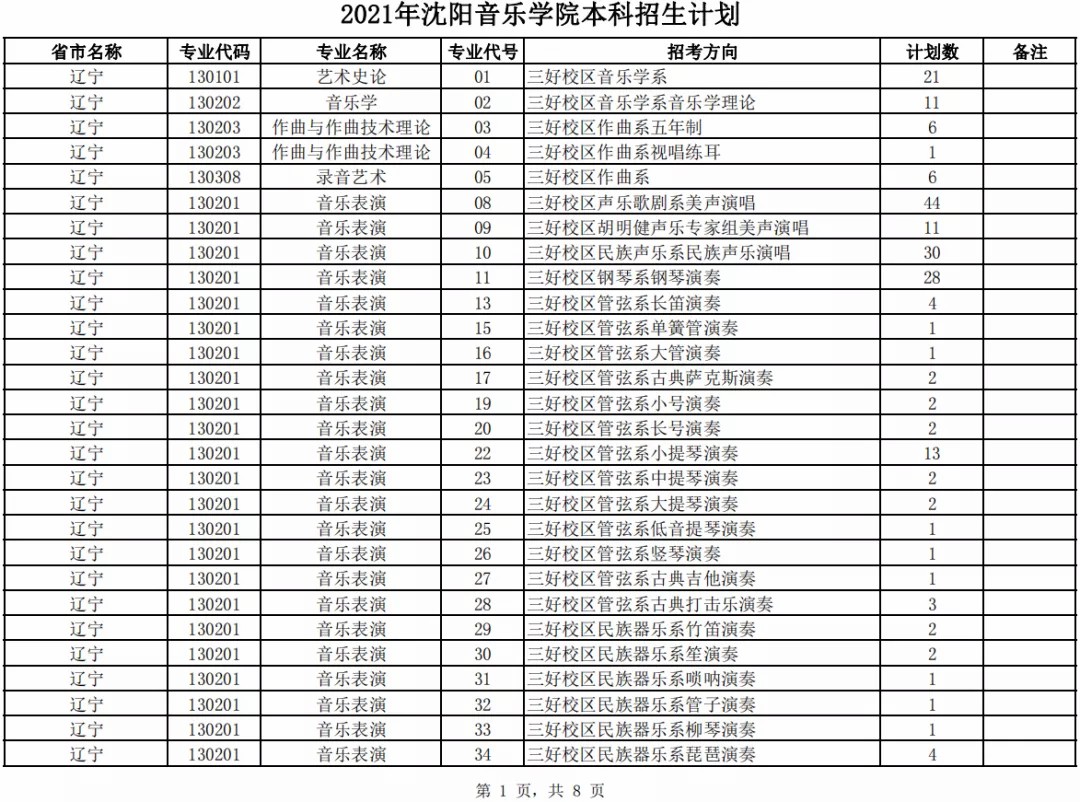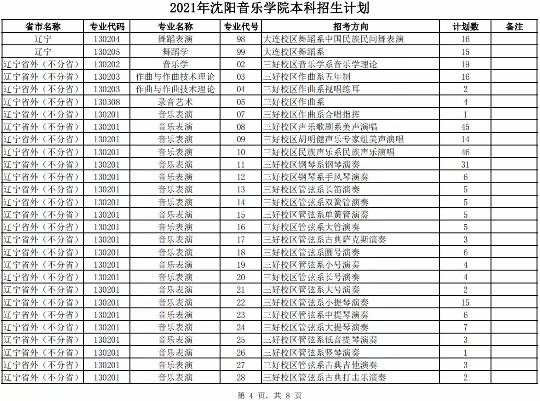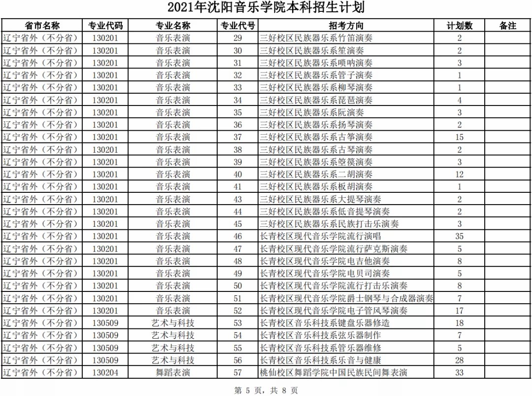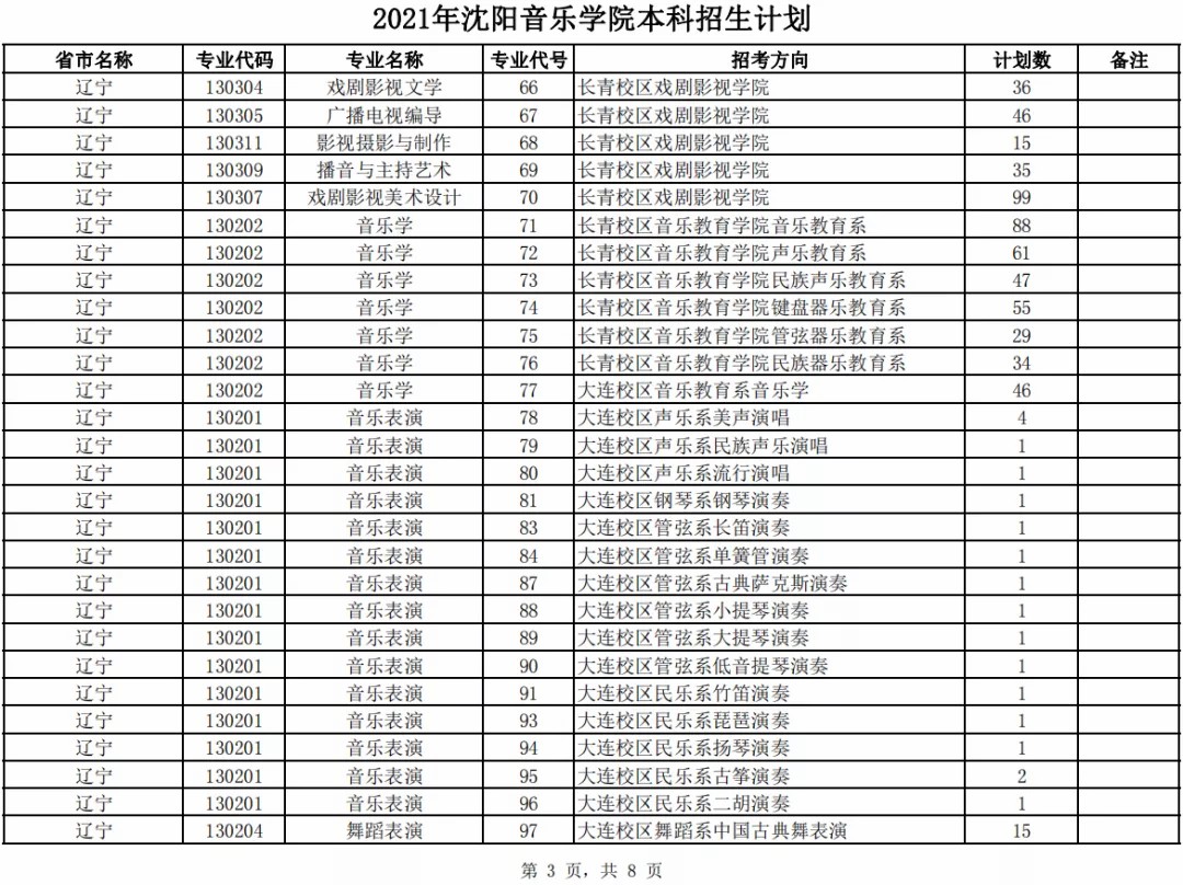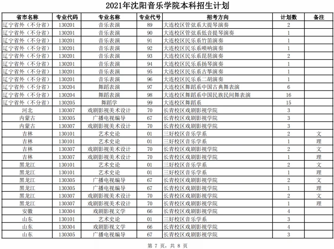 沈阳音乐学院2021年本科专业招生计划