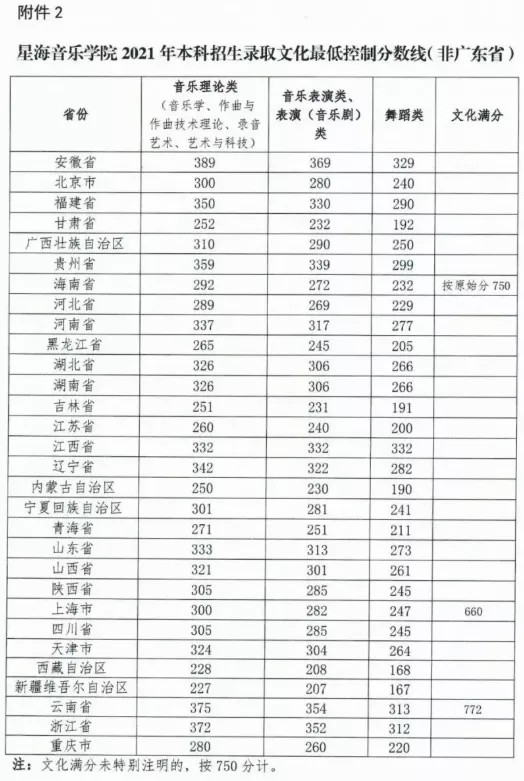 星海音乐学院2021年本科文化录取分数线