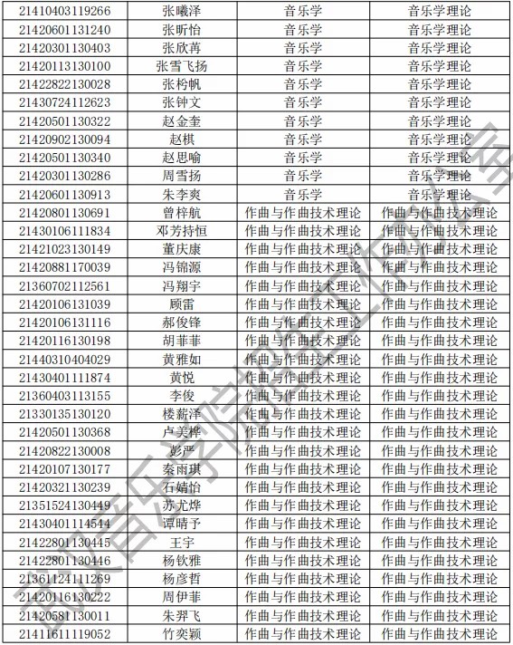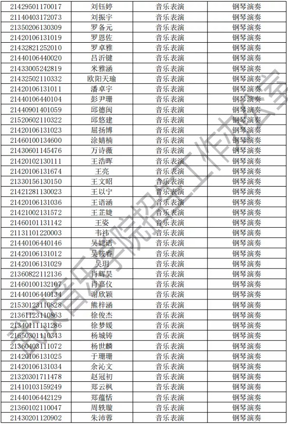 武汉音乐学院2021年本科专业拟录取名单