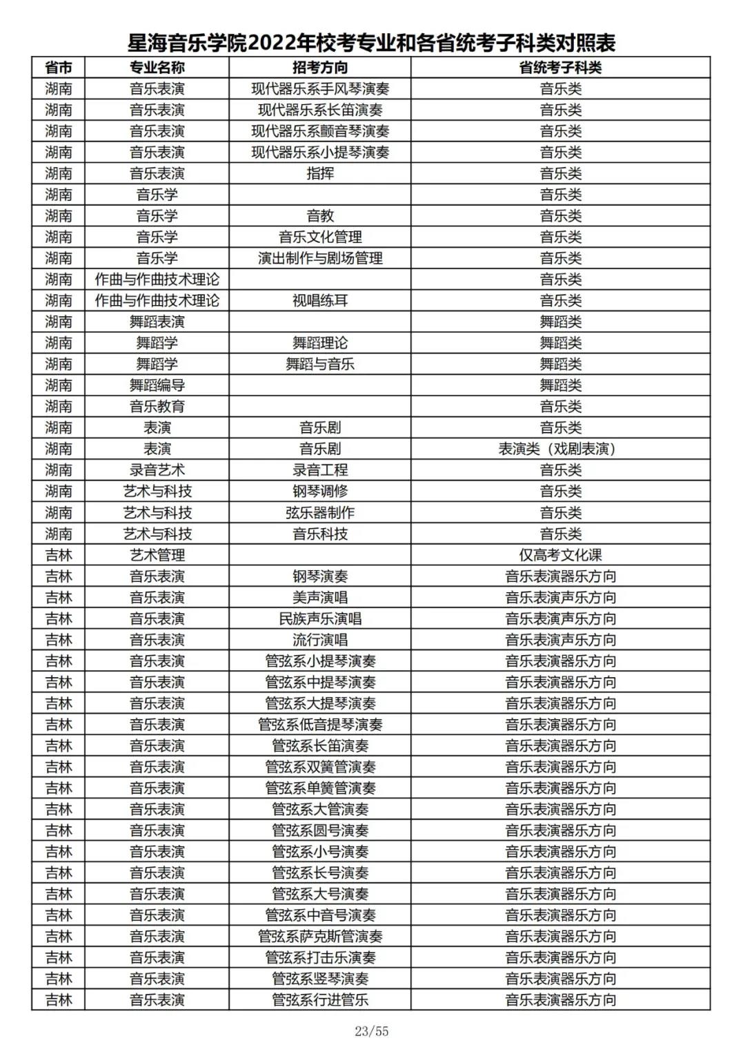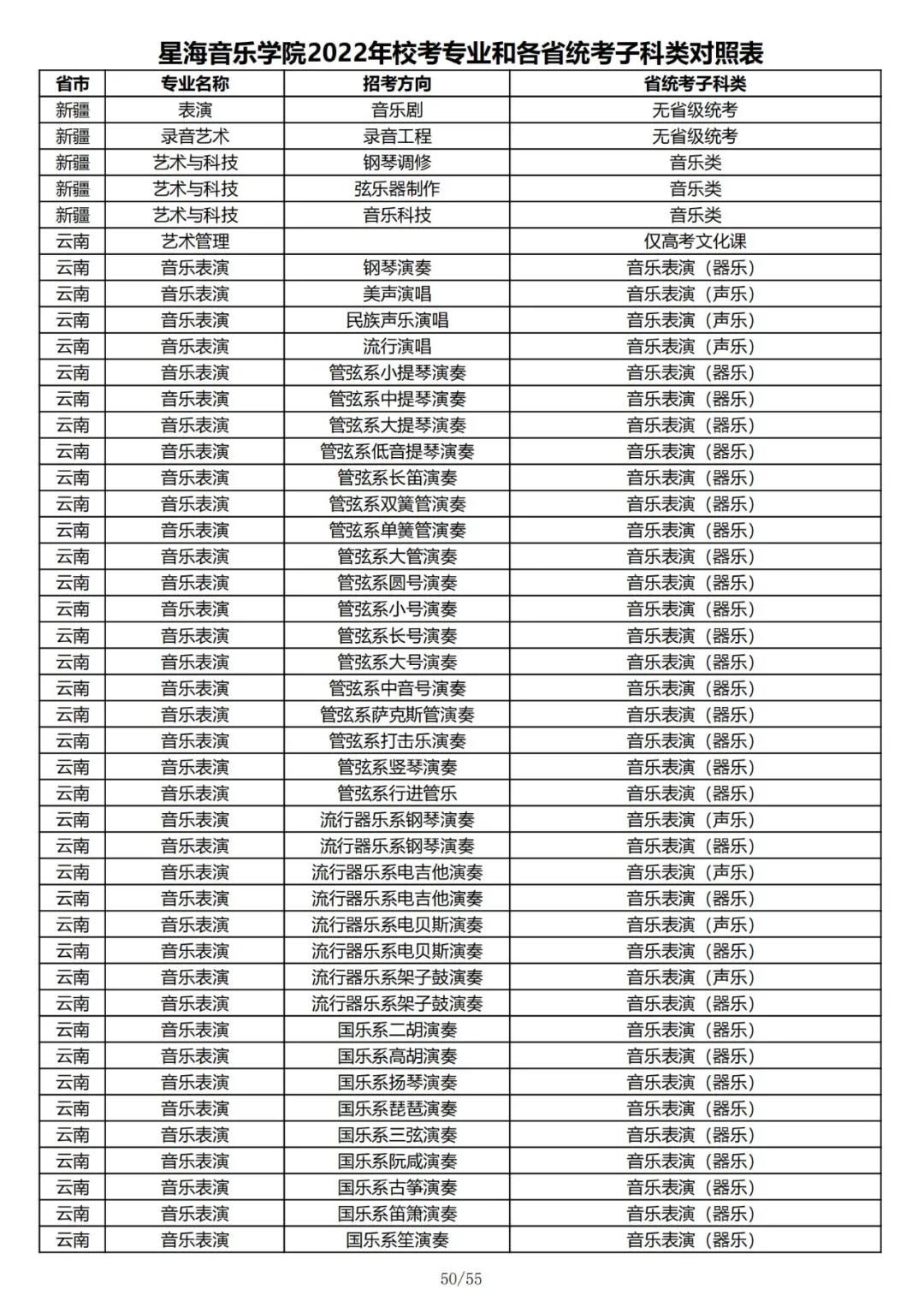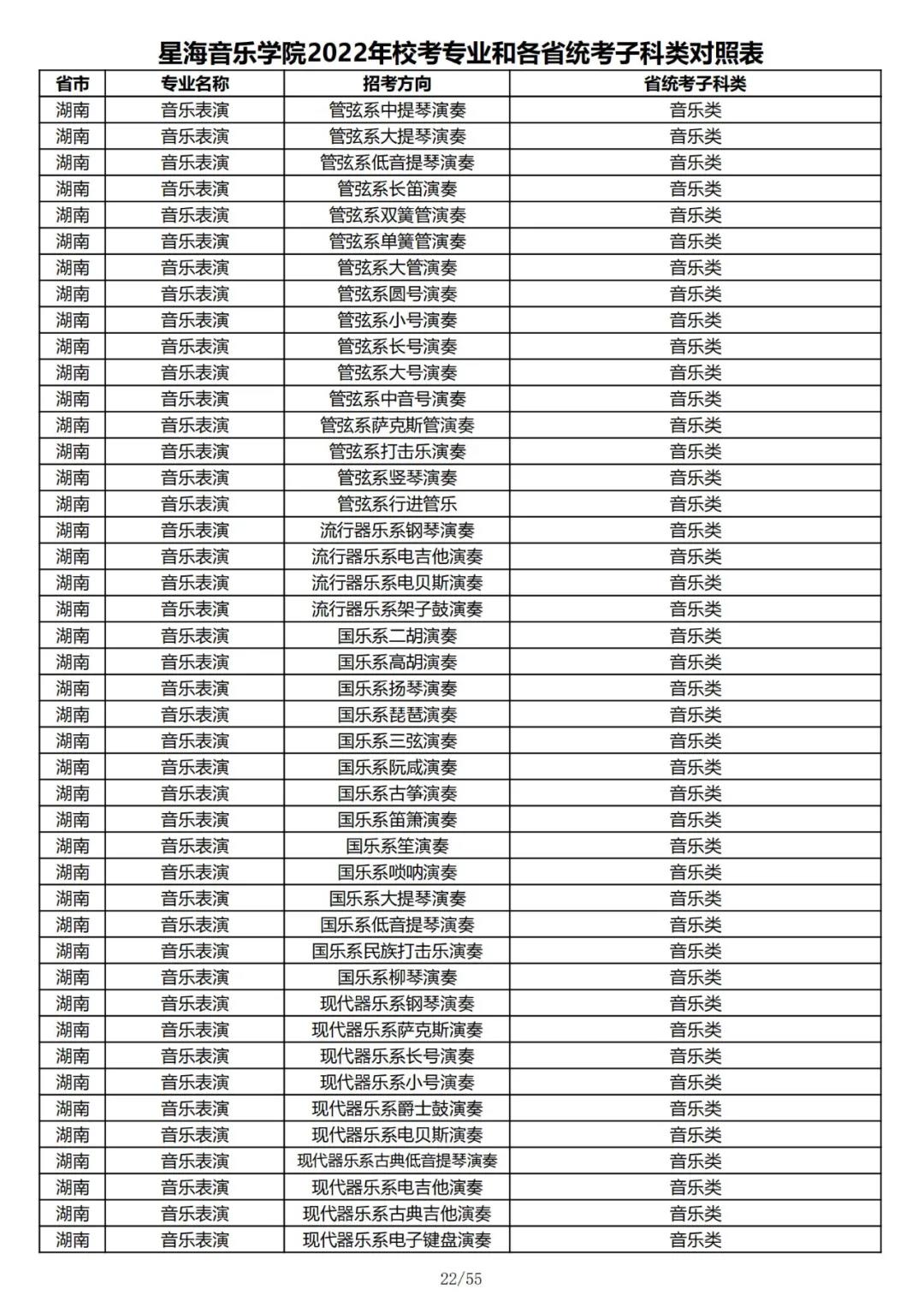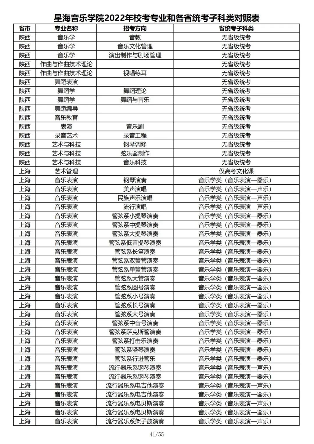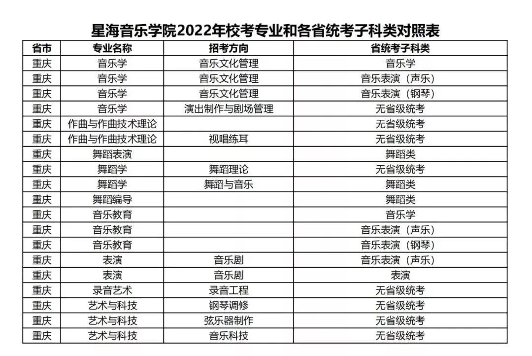 校考 | 星海音乐学院2022年本科专业和各省统考子科类对照表