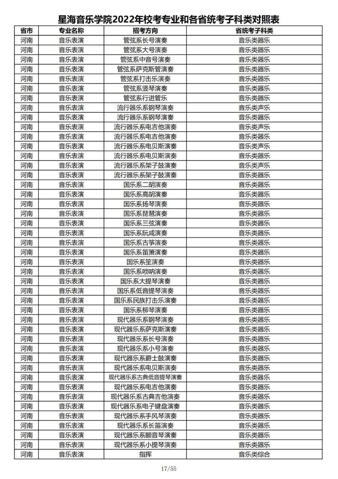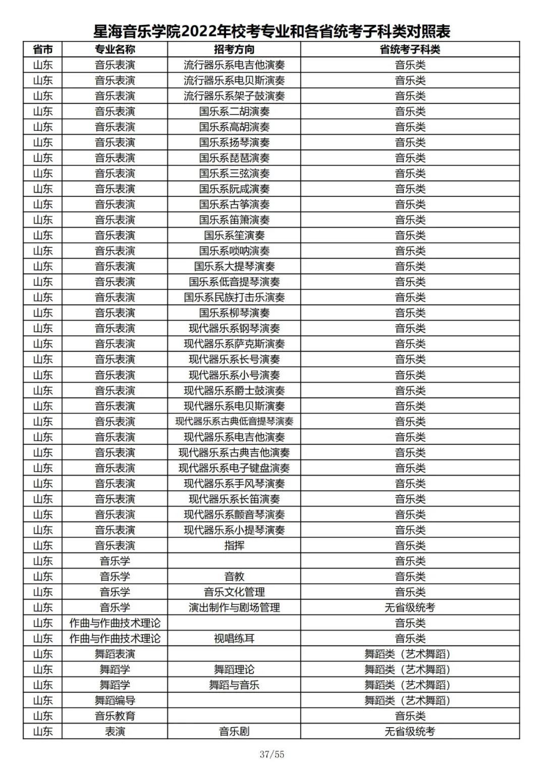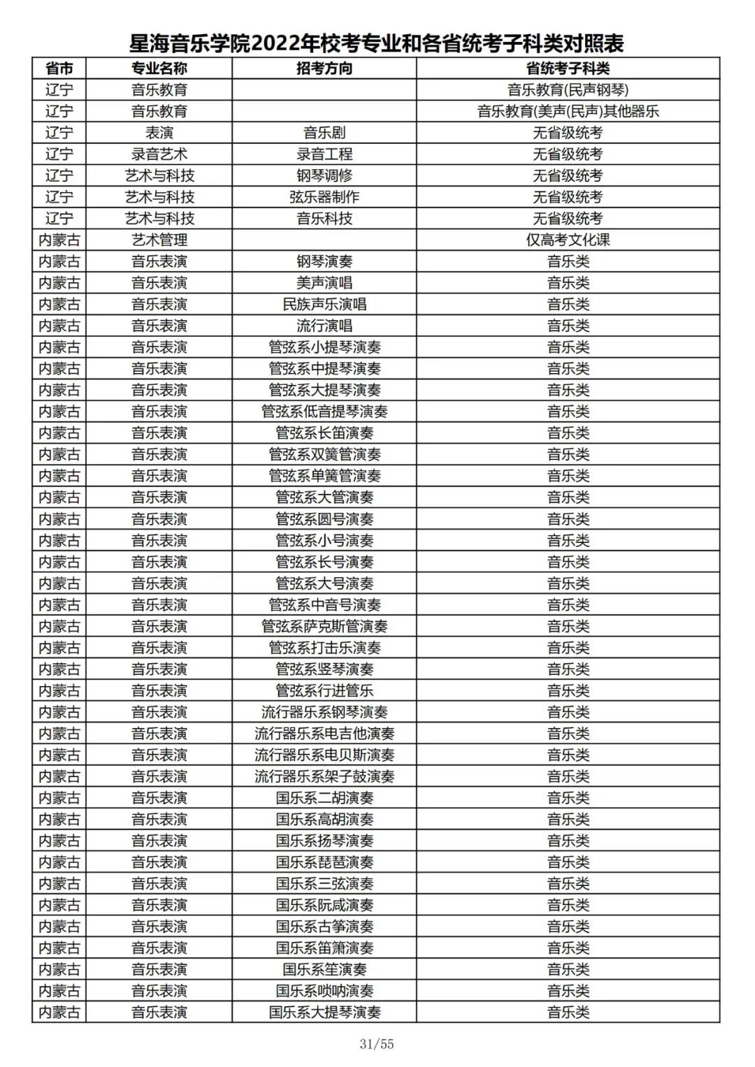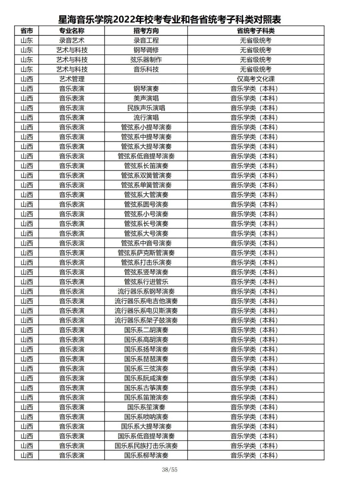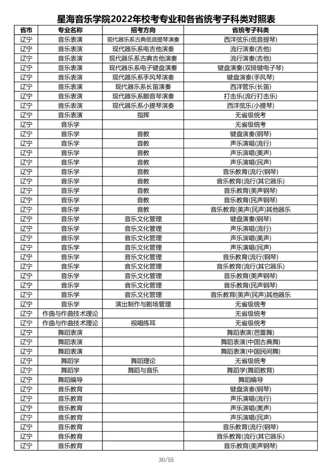 校考 | 星海音乐学院2022年本科专业和各省统考子科类对照表