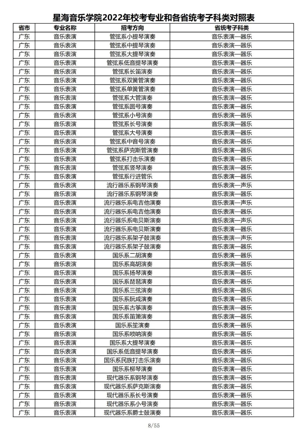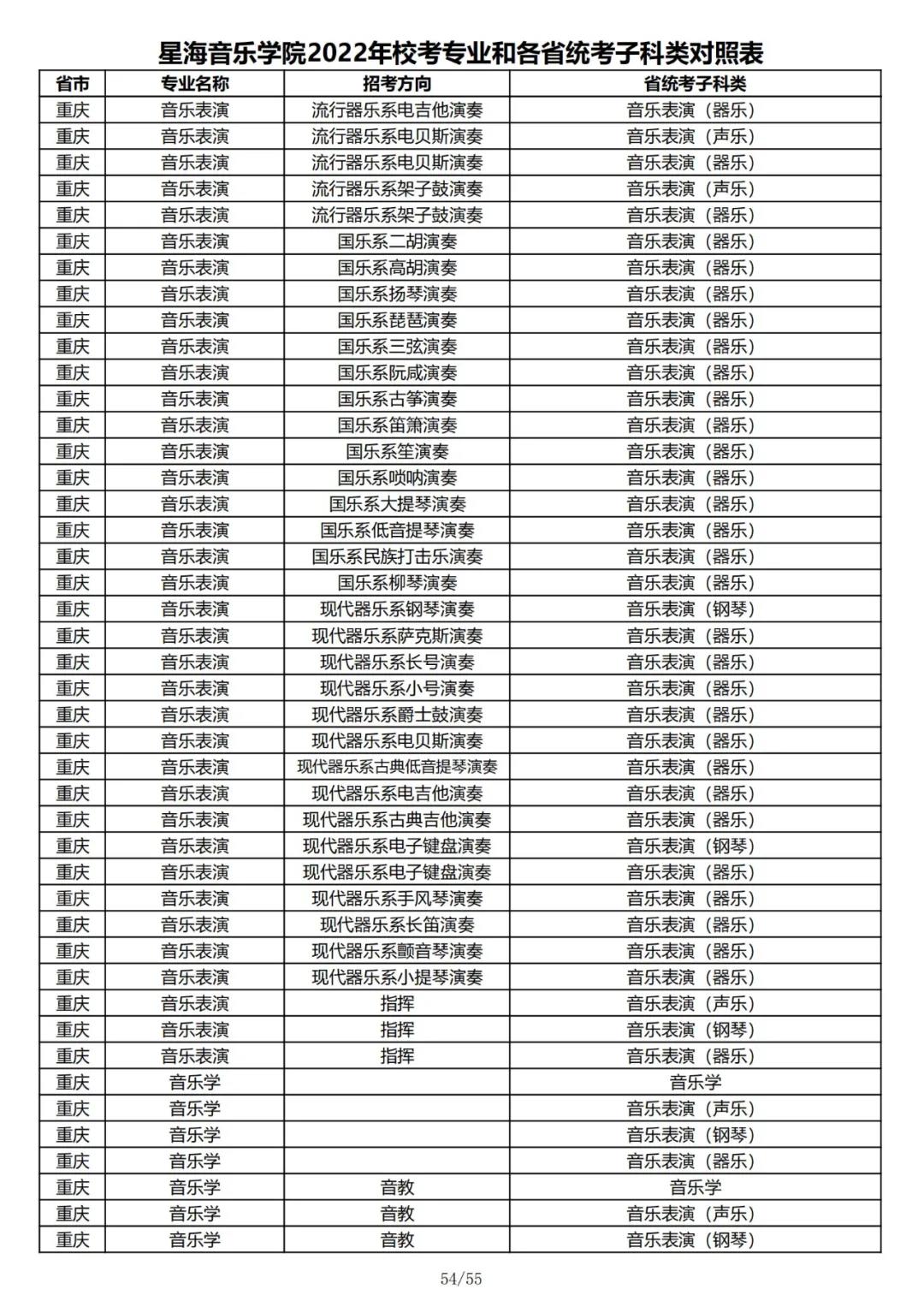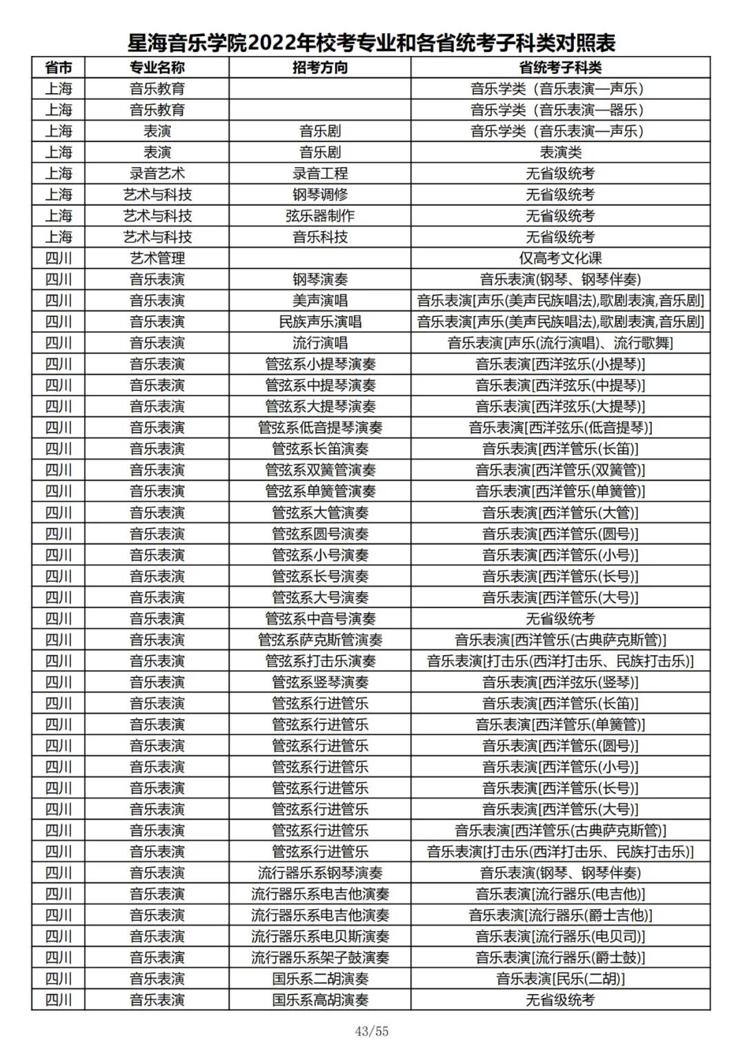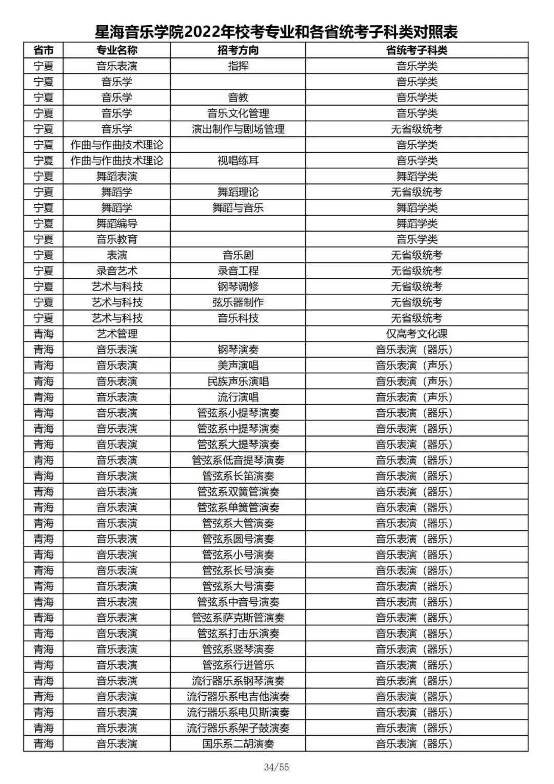 校考 | 星海音乐学院2022年本科专业和各省统考子科类对照表