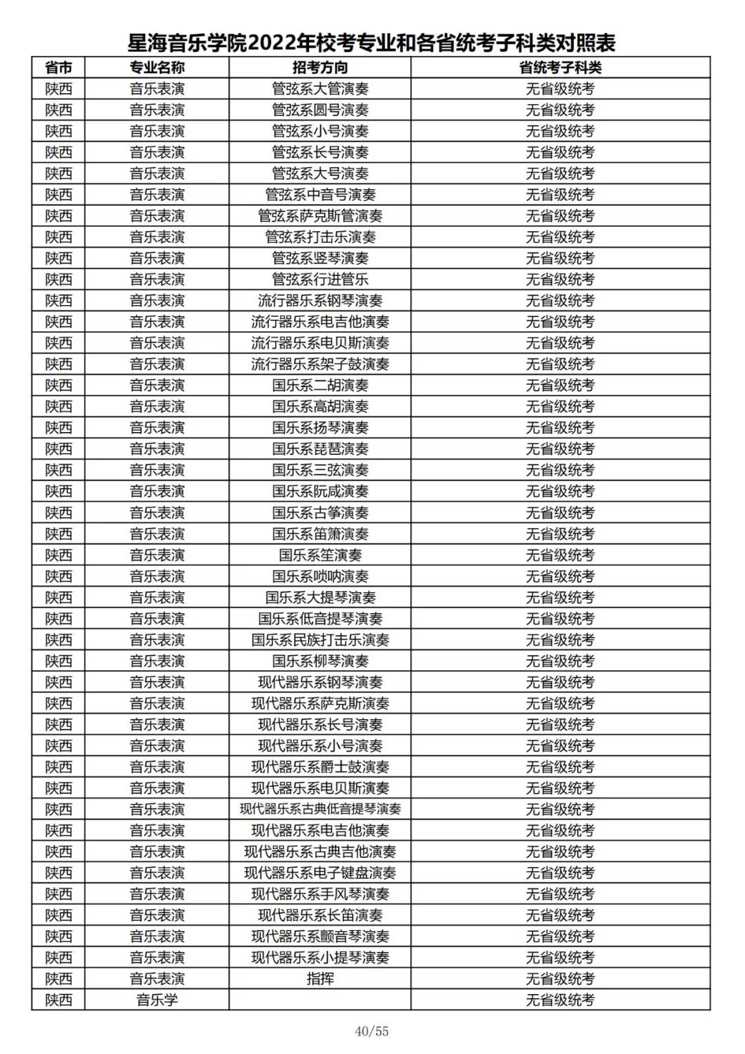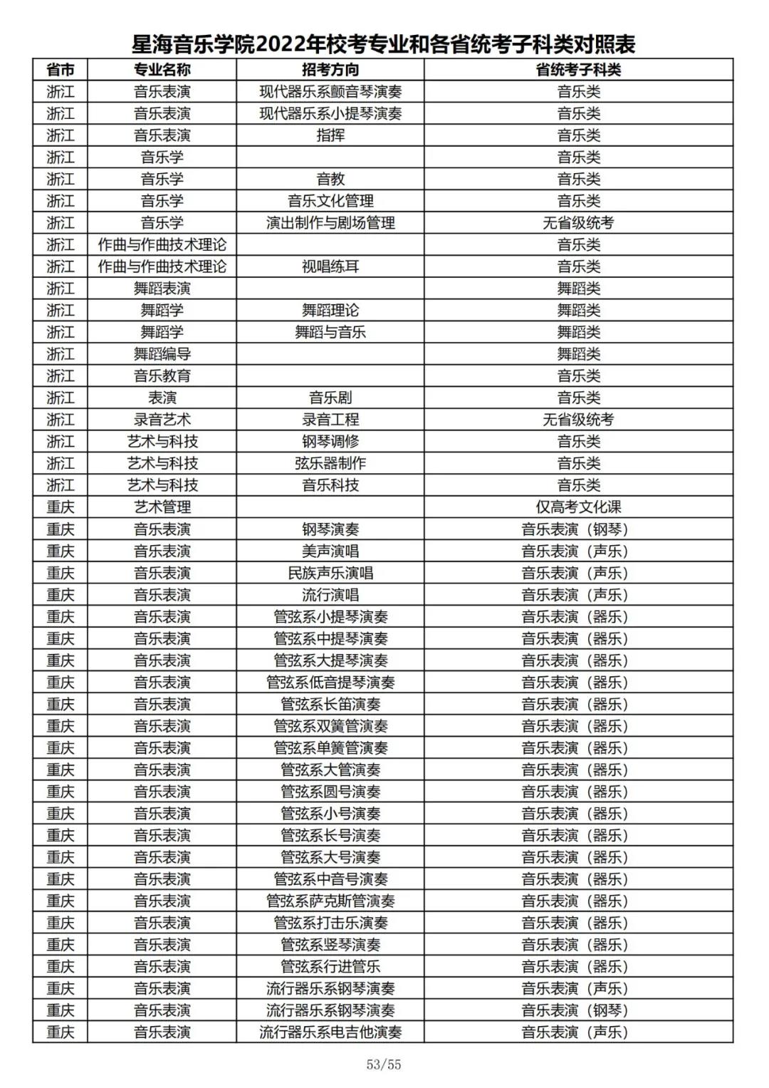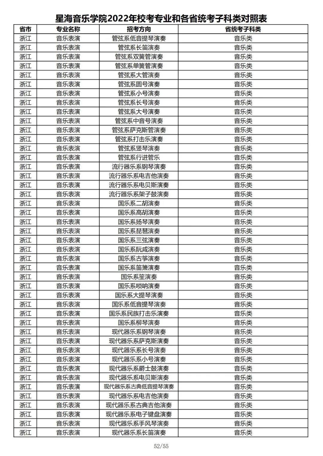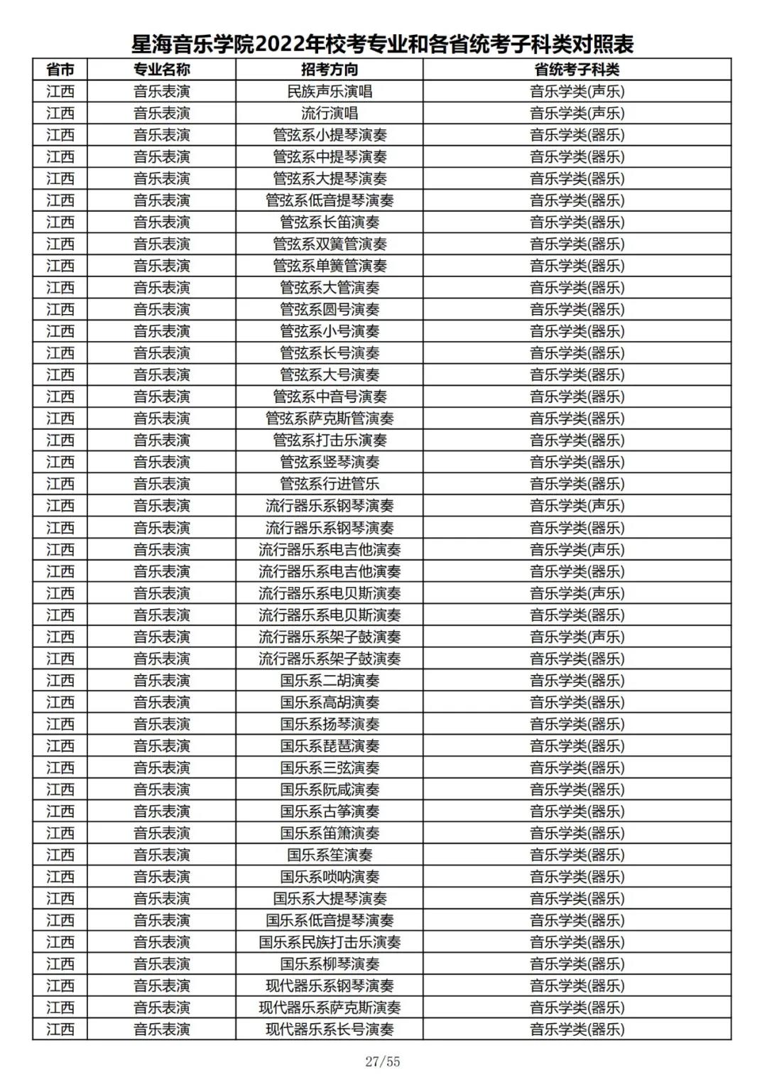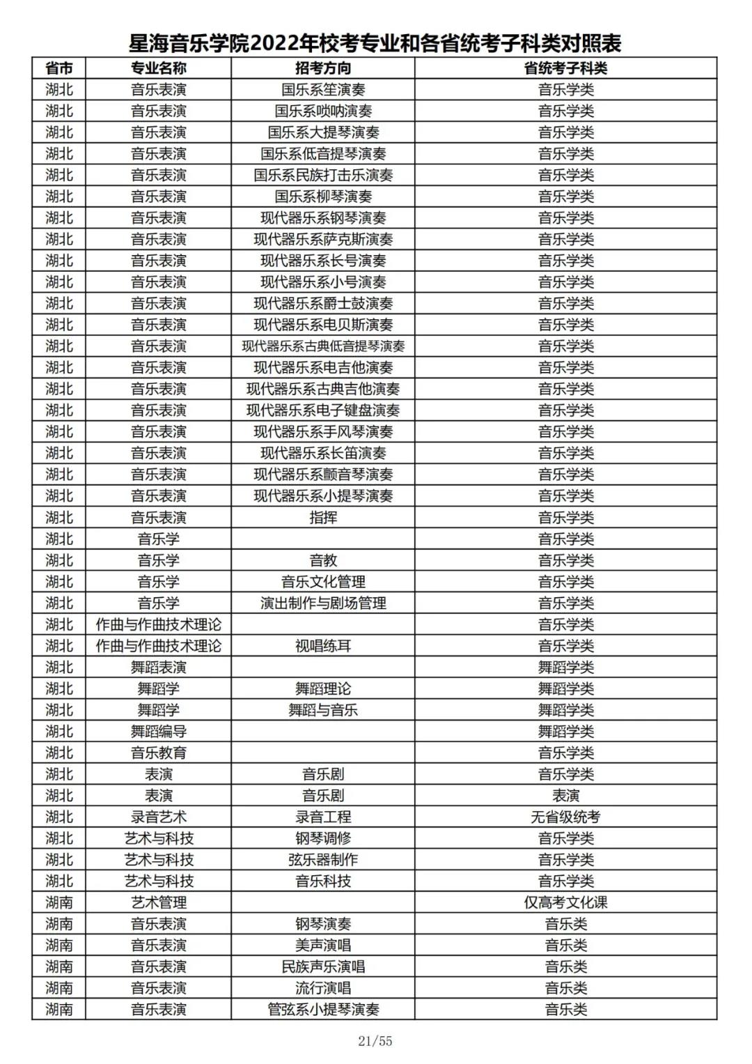 校考 | 星海音乐学院2022年本科专业和各省统考子科类对照表