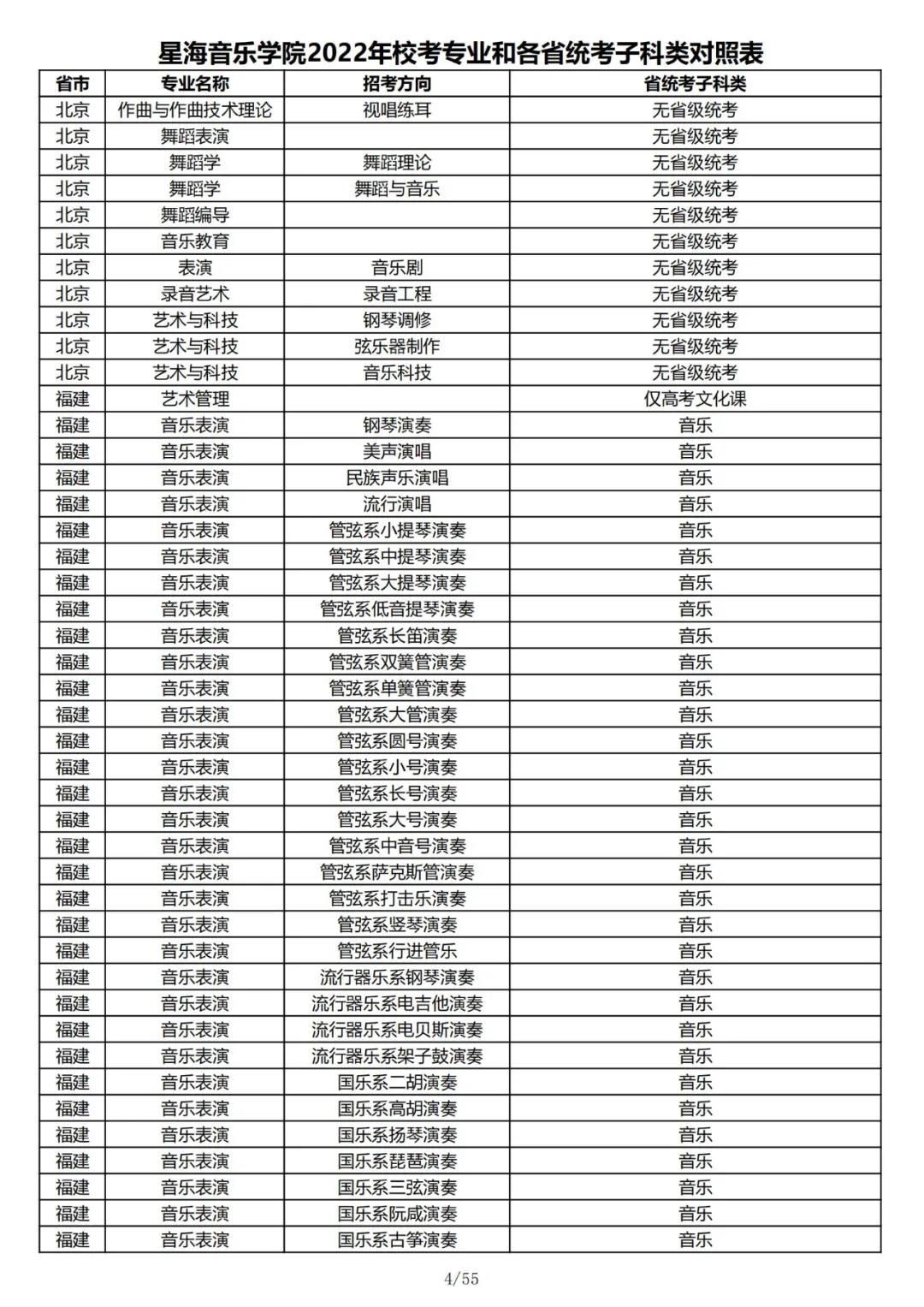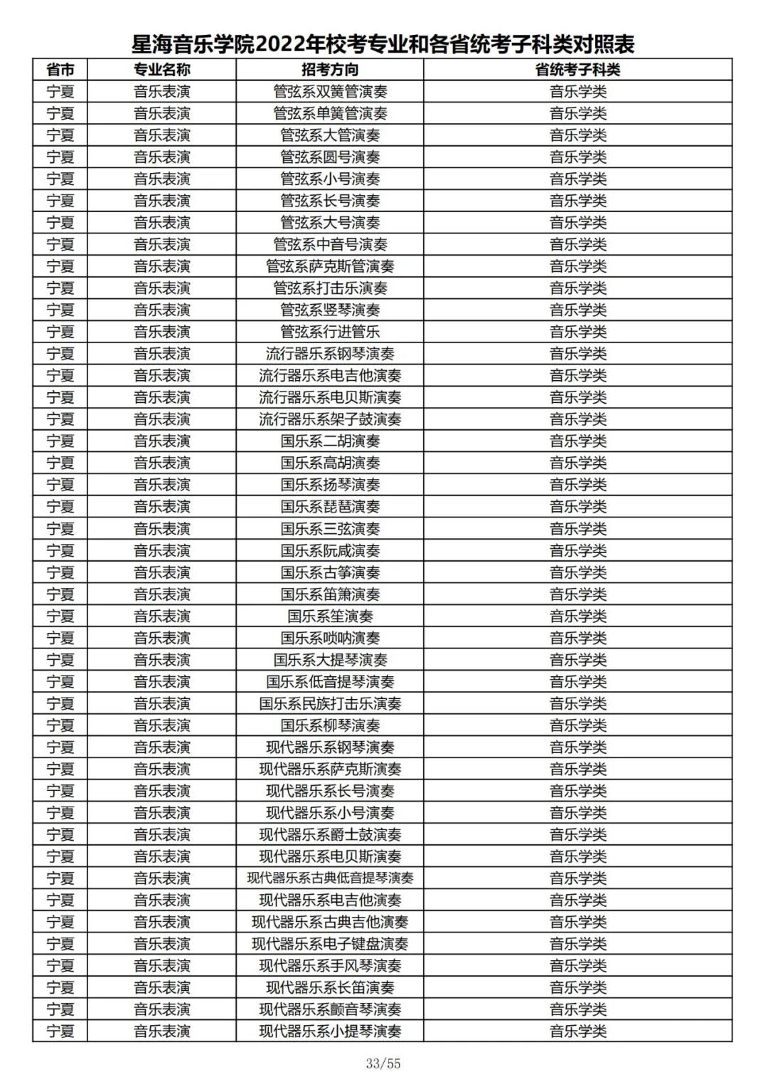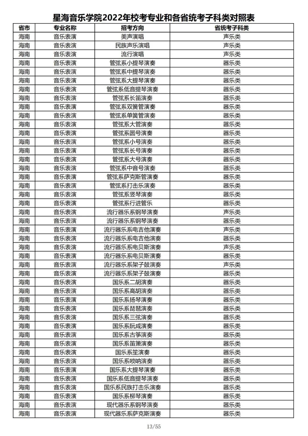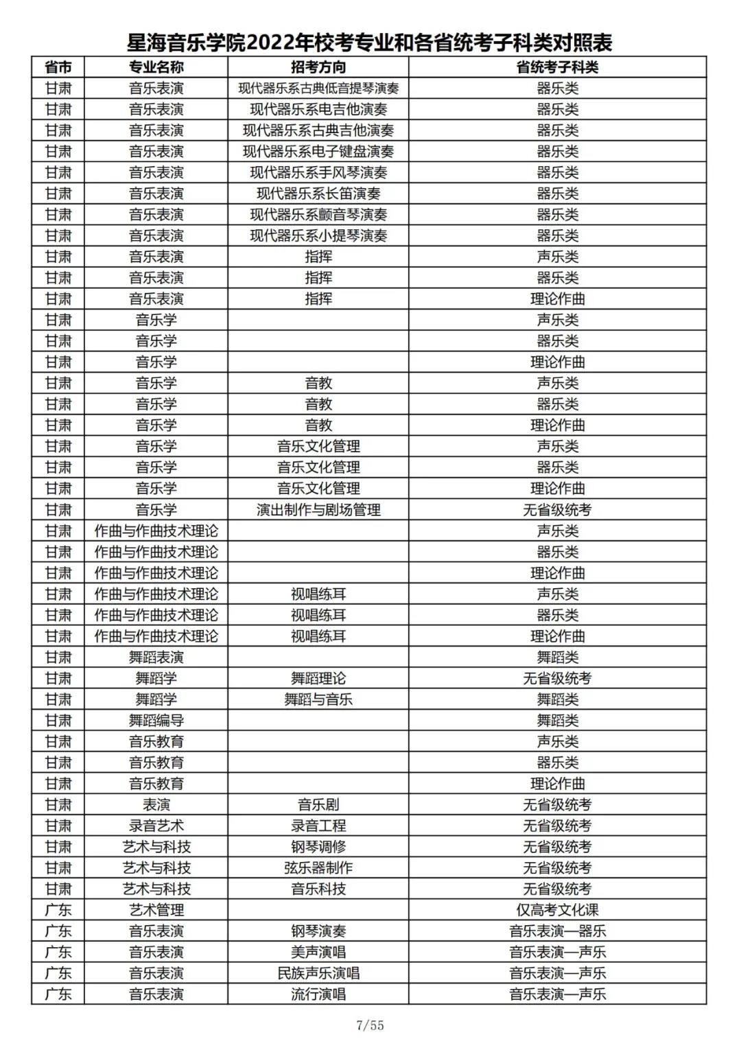 校考 | 星海音乐学院2022年本科专业和各省统考子科类对照表