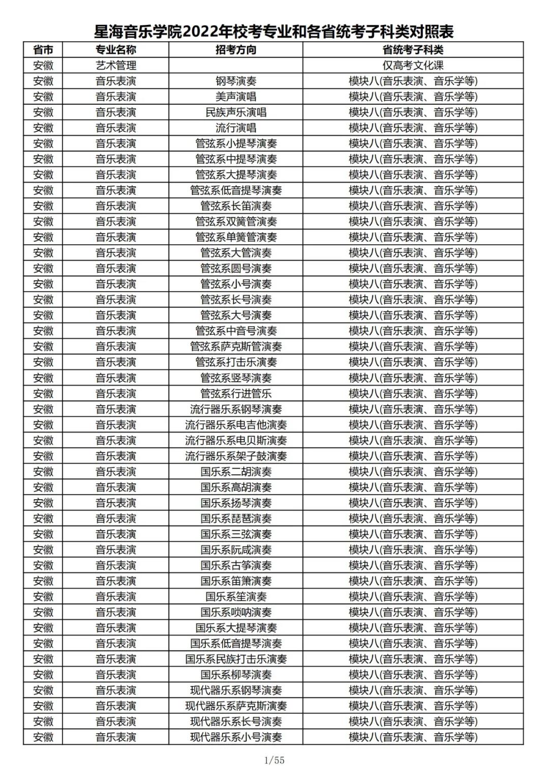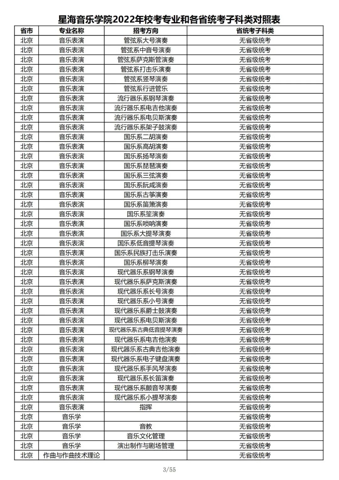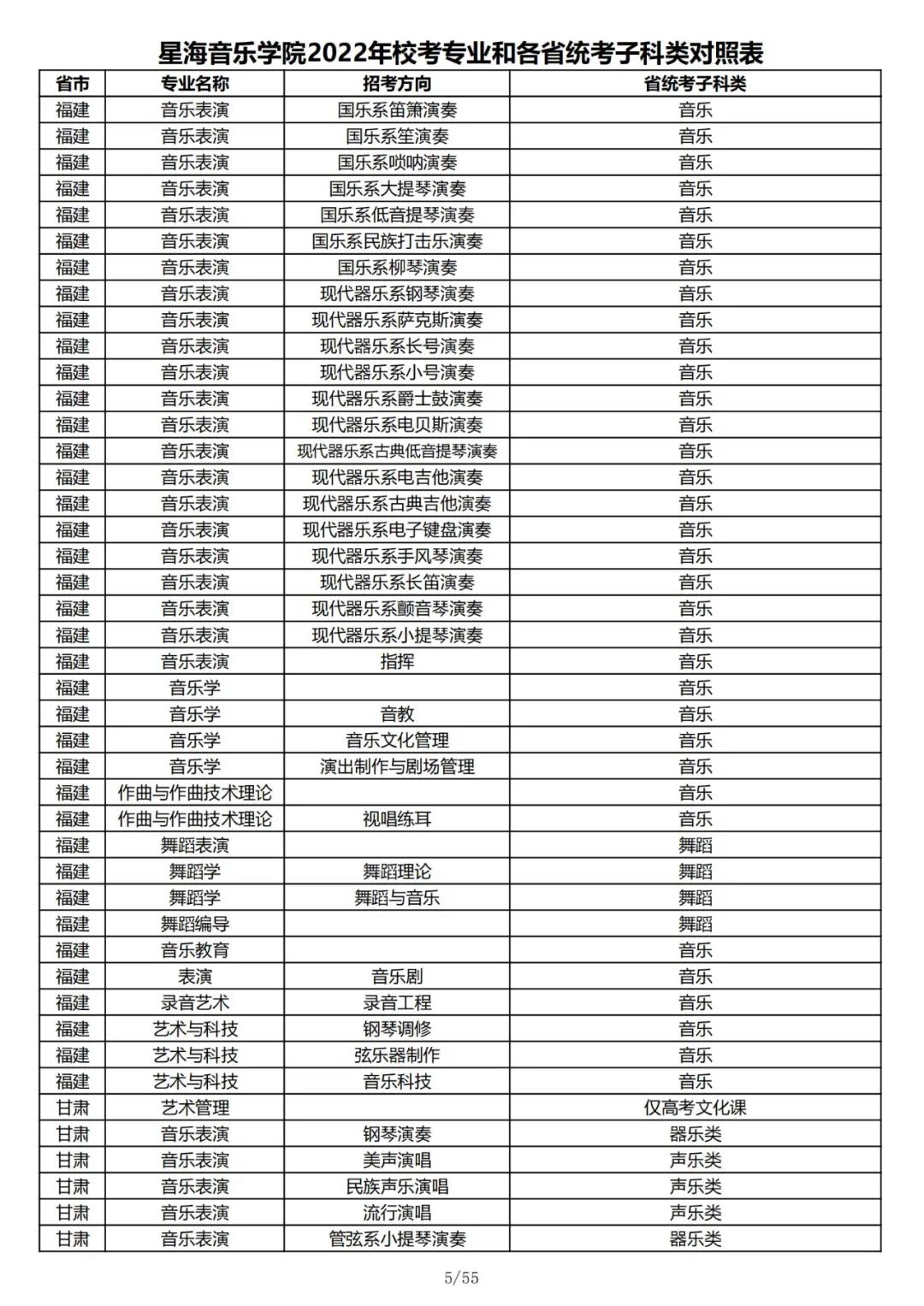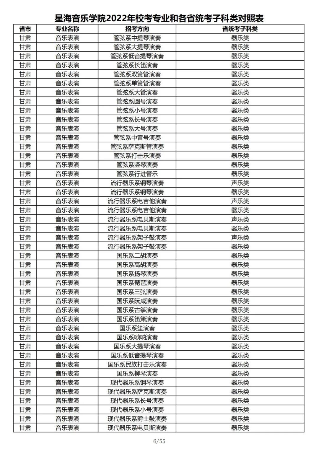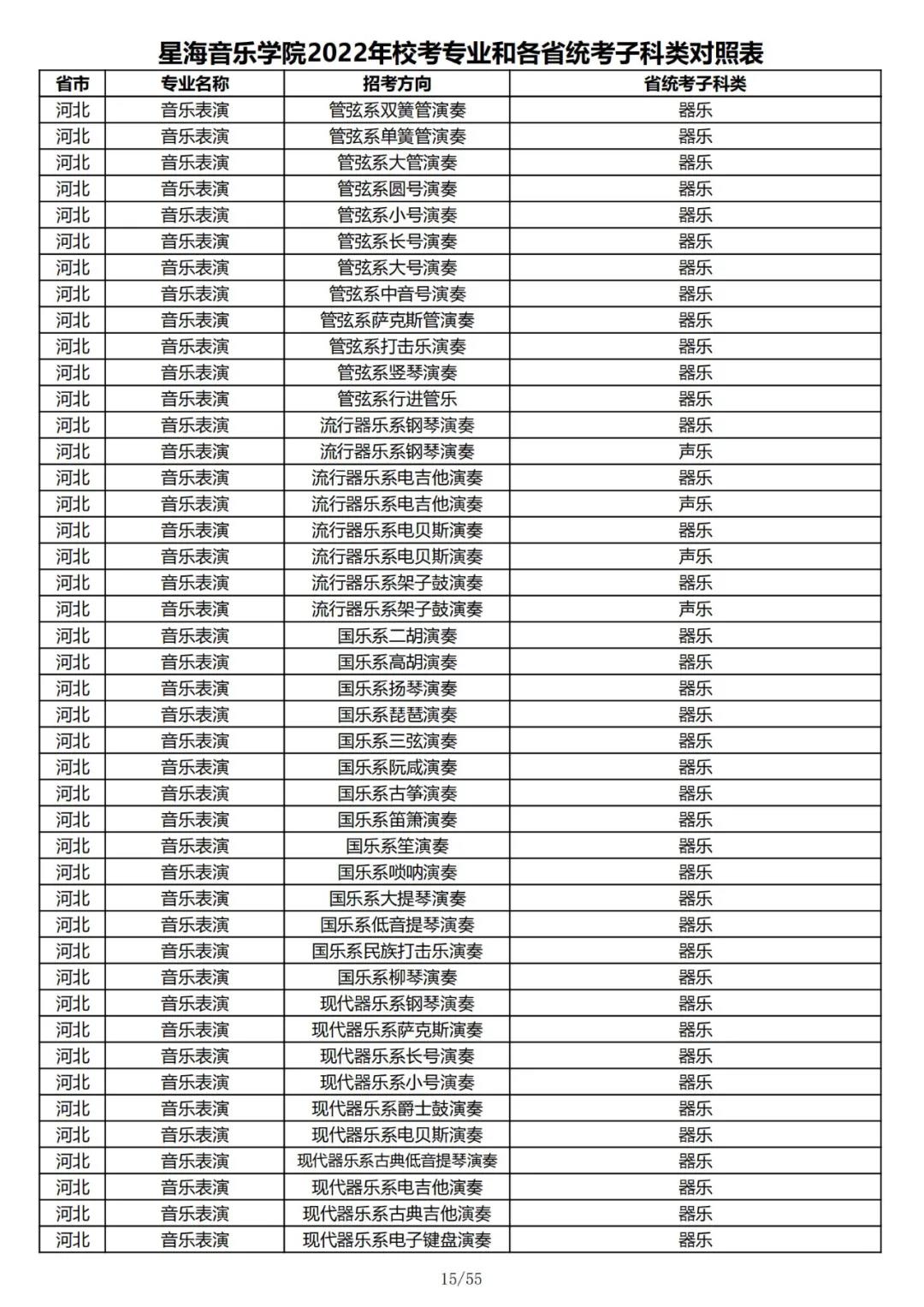 校考 | 星海音乐学院2022年本科专业和各省统考子科类对照表