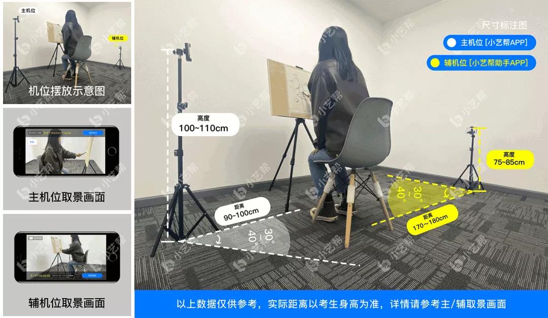 1.戏剧影视文学、戏剧影视导演、广播电视编导、影视摄影与制作、录音艺术、动画、戏剧影视美术设计专业的校考采取“双机位考试”模式,考生须准备两部智能手机作为考试终端。考生仅可使用两部手机完成考试:一部手机使用“小艺帮”APP用于考试作答(主机),另一部手机使用“小艺帮助手”APP用于考试监考(辅机)。如有作答环节,考生直接面对主机进行作答。
