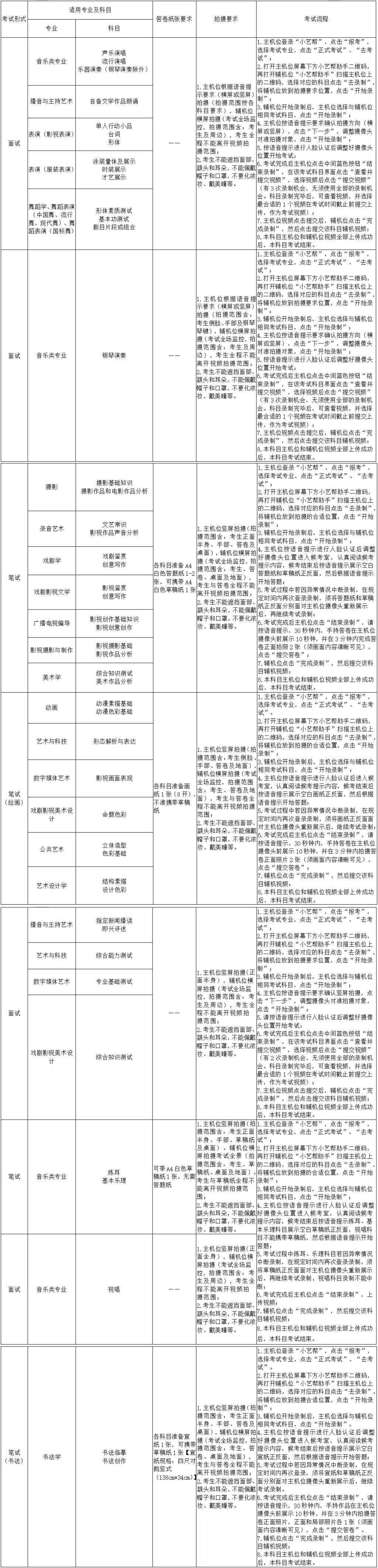面试类按各科目要求进行表演、展示、口述;笔试类专业选择题和判断题直接在考试系统上作答,问答题(含名词解释、填空题、简答题、论述题、分析题、写作题、赏析题等)在自备A4答题纸上作答(为方便书写,可提前在答题纸上打横格);绘画类在自备画纸(8开)上作画;书法类在自备宣纸【四尺对裁竖式(138cm*34cm)】上书写。
