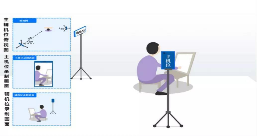 【主机位根据考试科目要求确定拍摄方向(横屏或竖屏)及拍摄范围(半身或全身),辅机位横屏拍摄(考试全场监控,拍摄范围含:考生及周边),考生全程不能离开视频拍摄范围】