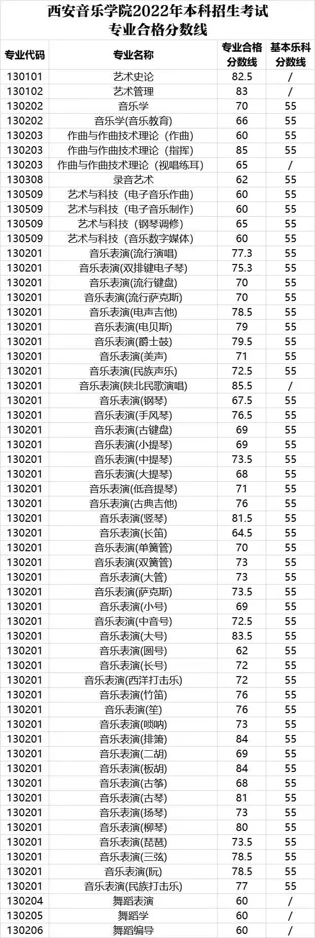 西安音乐学院2022年录取分数线