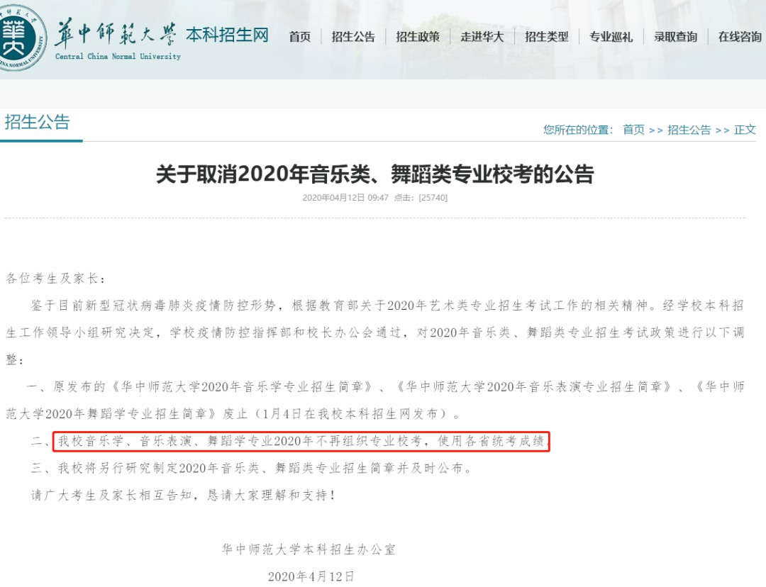 例如华中师范大学因取消2020年音乐学、音乐表演专业校考,参考使用各省专业统考成绩录取。
