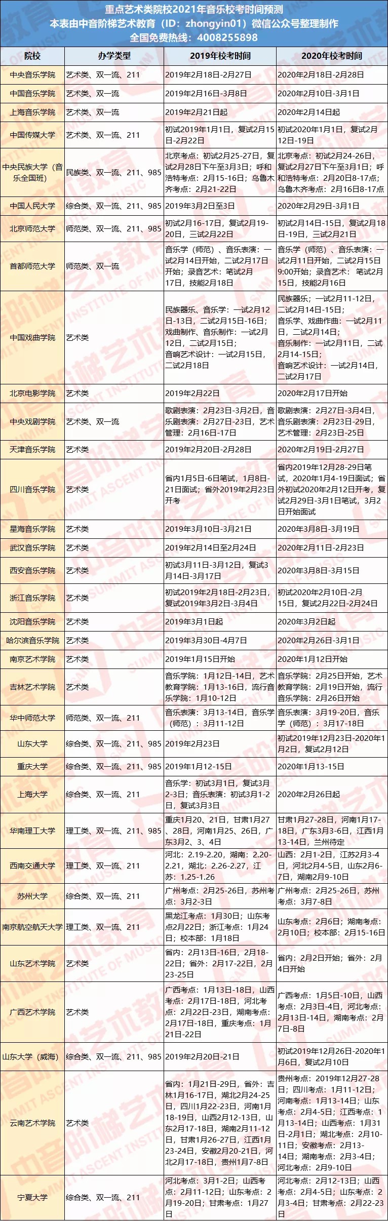 对比院校2020年与2019年考试时间,一半院校表现为提前了3-7天。不确定今年是否会出现新冠,预测2020年校考时间相对较难,家长及考生可自行估测。