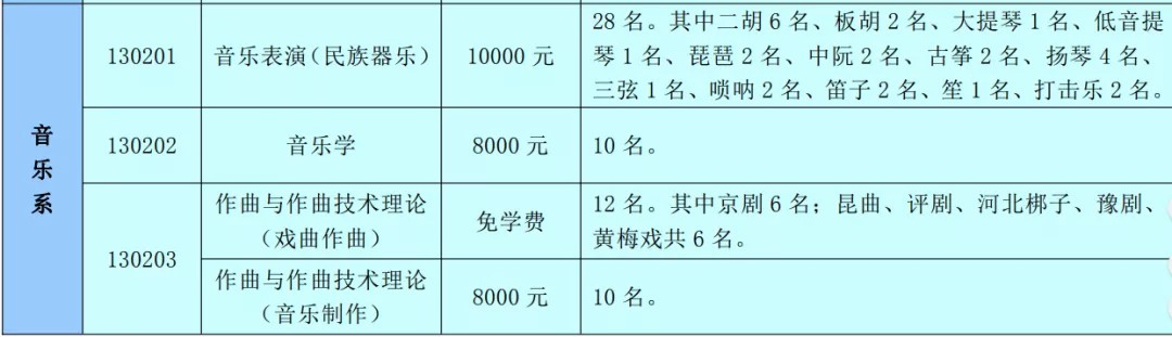 免费专业:表演(京剧器乐)、表演(京剧表演)、表演(昆曲表演)、表演(多剧种表演)、表演(昆曲器乐)、表演(多剧种器乐)、作曲与作曲技术理论(戏曲作曲)。