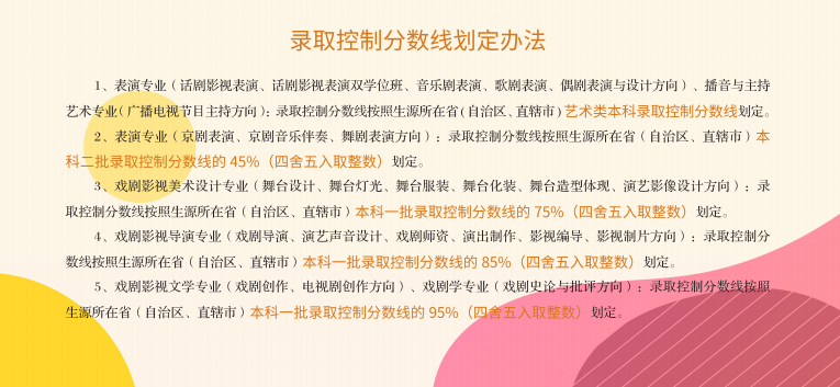 表演专业(话剧影视表演、音乐剧表演、京剧表演、京剧音乐伴奏、歌剧表演、舞剧表演方向);戏剧影视导演专业(戏剧导演、演艺声音设计、电影导演方向);播音与主持艺术专业(广播电视节目主持方向);戏剧影视美术设计专业(舞台设计、舞台灯光、舞台服装、舞台化装、舞台造型体现、舞台技术方向);戏剧影视文学专业(戏剧创作、电视剧创作方向);戏剧学专业(戏剧史论与批评方向);戏剧教育专业;艺术管理专业(演出制作、剧院管理、影视制片方向)。