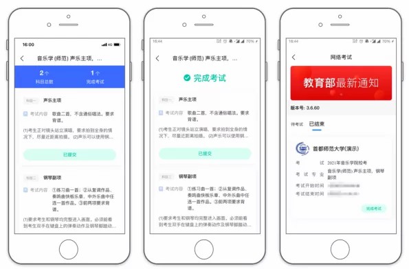 首都师范大学(面向北京市)招生简章明确规定:音乐学(师范)专业、音乐表演专业考试形式为:网络考试。网络考试包含和正式考试。考生须先完成,再进行正式考试。正式考试时,每个考试科目较多允许录制3次,录制的视频可以回看。请务必确认视频回放正常、确认视频内容无误后再上传提交。上传只能进行一次,已上传的视频无法替换。2月2日24:00前未完成上传提交视为弃考。