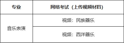 考试为网络考试(上传视频材料),均为技能测试,考试科目分为民族器乐和西洋器乐。