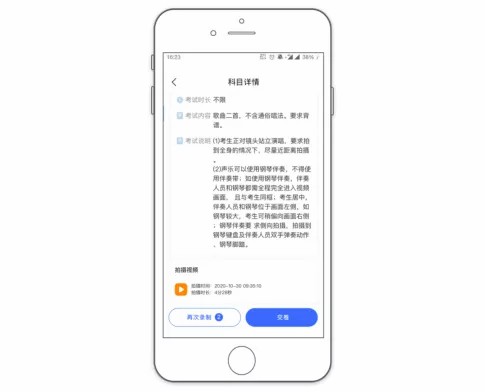 (1)录像完成后返回到考试界面,向下滑动会显示出刚拍摄的视频,并附有拍摄时间和拍摄时长。