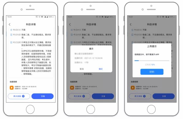 (6)中录制的视频不能作为考试视频提交,但可以回看、确认录制、测试视频占用存储空间的情况。中的[提交]并不会向服务器提交录像,点提交后会删除在中录制的视频、释放手机存储空间。以下仅介绍正式考试操作流程。