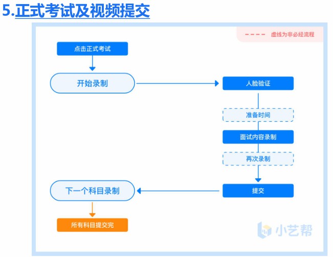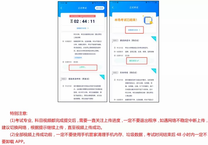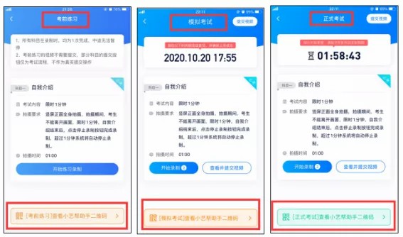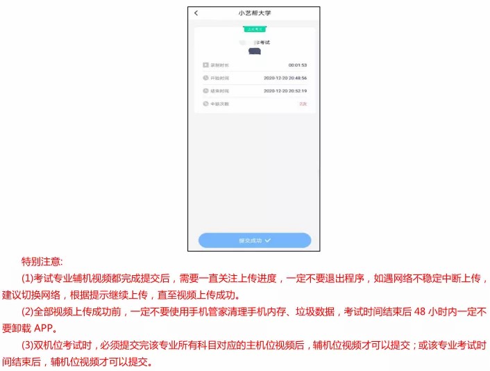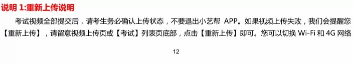 (四)每个考试科目较多可进行3次视频录制,考生可选择较满意的一次提交上传作为考试视频,须所有科目视频都上传成功,不得提前退出小艺帮APP。如遇到网络异常,请尝试切换Wi-Fi或4G网络,并按系统提示重新上传视频。正式考试视频,一经上传,无法更改。