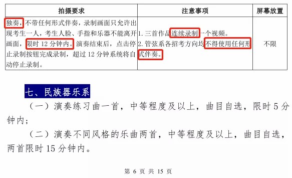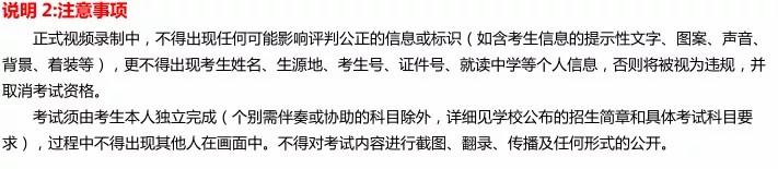 (七)所提交的视频中,不得出现任何可能影响评判公正的信息或标识,如含考生信息的提示性文字、图案、声音、背景、着装等,不得出现任何可能被判定为作弊的声音、文字、图案、材料、人物及其他物品。