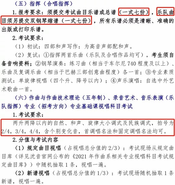 (一)报考音乐学系音乐学理论(五年制)招考方向、作曲系作曲与作曲技术理论(五年制)、乐队指挥、合唱指挥招考方向、录音艺术专业的考生,须按专业考试要求将考试相关材料于2月23日至2月25日期间邮寄(以寄出邮戳为准)至沈阳音乐学院招生办。逾期不交者,视为自动放弃报考资格。