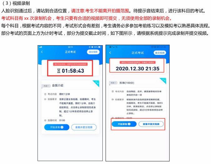 (九)视频录制时注意光线,画面保持稳定、声像清晰,声音、图像同步录制。录制时必须连续不间断拍摄,不支持变焦、暂停、编辑等功能、不得切转画面,录制过程中考生全程不得离开画面;视频不得剪辑,不得采用任何视频编辑手段美化处理画面,不得采用任何音频编辑手段美化编辑音频,全程不允许使用麦克风等传声设备。考生须对本人提交的考试视频等考试材料的质量、清晰度负责,因考试视频不符合评审要求而影响评审的,后果由考生自负。