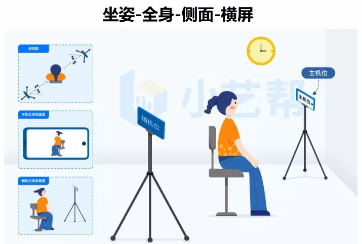 (六)考试须在独立、安静、明亮的房间进行,录制画面主机位仅允许出现考生本人(国际标准舞舞伴除外)。辅机位须放置于考生左(或右)后方2-5米范围内,与主机位基本呈对角线。拍摄参考图示见《视频拍摄参考图示》(附件3)。双机位具体操作请详阅《小艺帮APP操作说明》(附件2)。